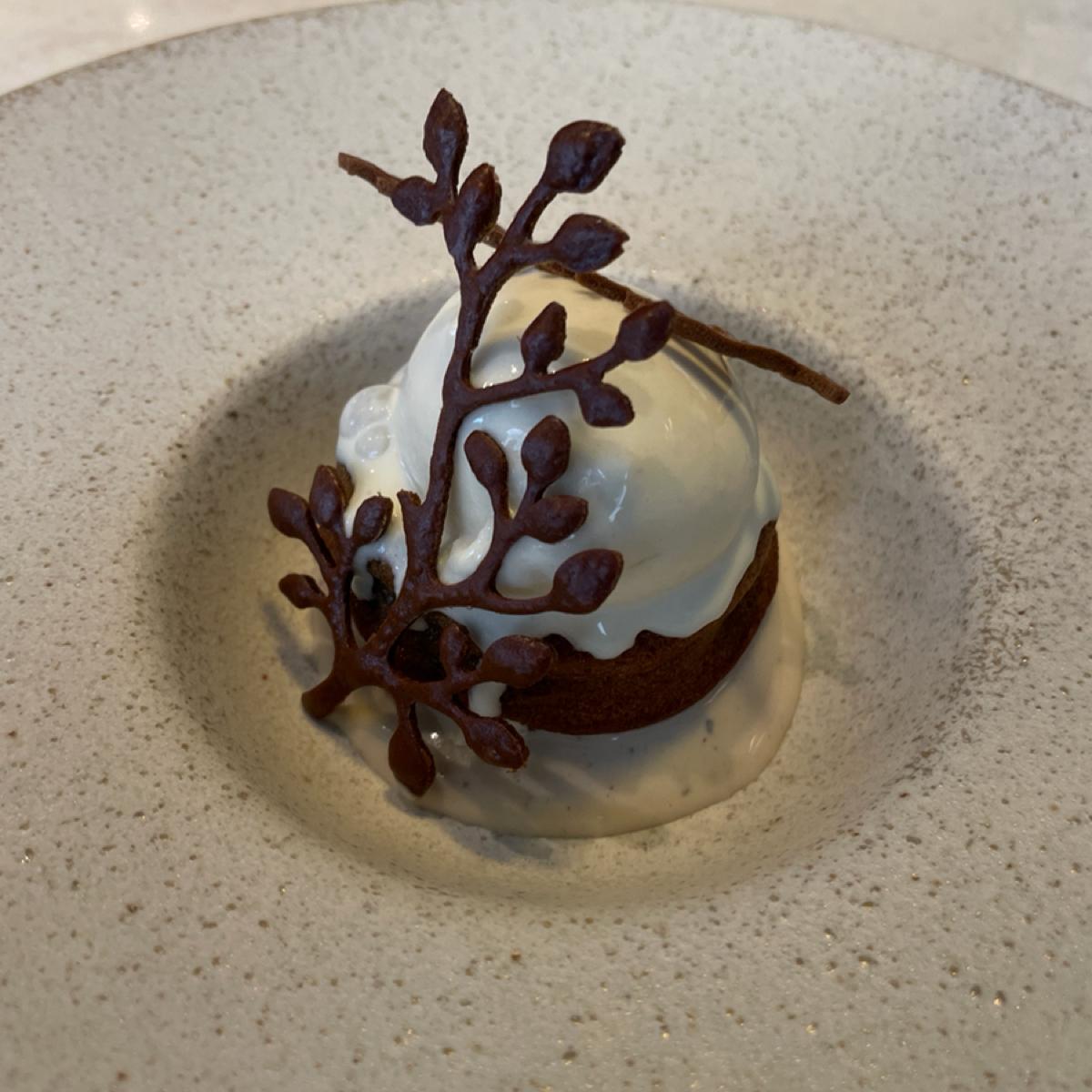 店員說這道是Australian Christmas Cake,因為澳洲聖誕節都要吃熱蛋糕;蛋糕上放上一球焦化奶油冰淇淋,下面是尤加利葉做的卡士達醬,會有個精油味;不過這道我覺得又有香茅味了,和想像中的熱蛋糕不太一樣,這道一樣不是我的菜