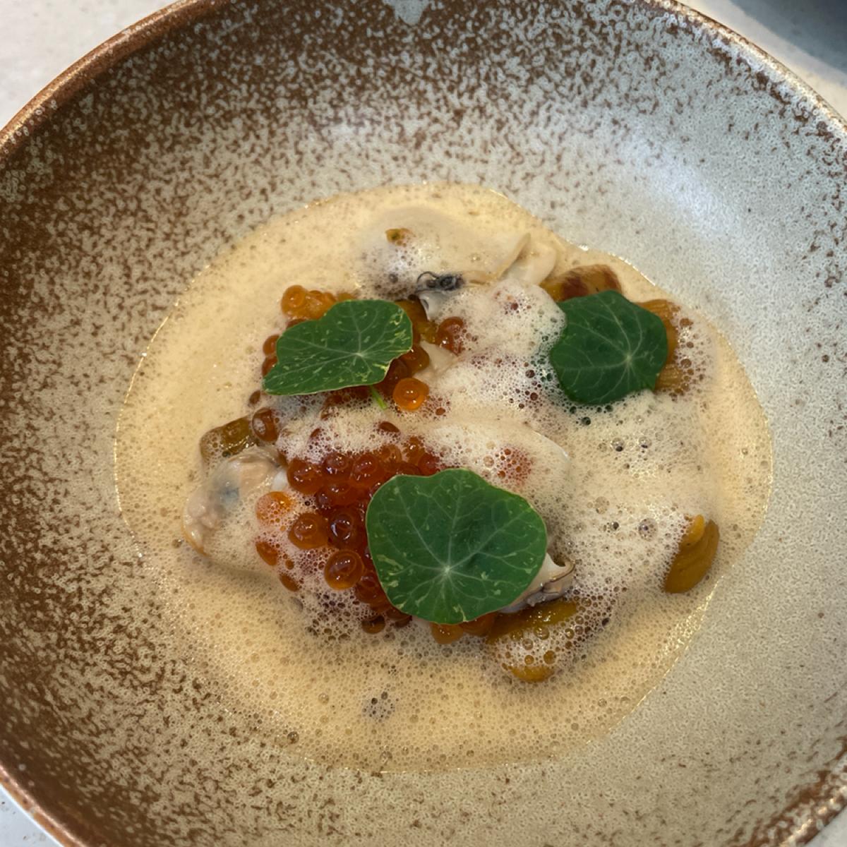 吃起來就是個炸菇,蠻油的,店員說樹梓吃起來會有咖啡和巧克力香氣,但沒什麼感覺,這道沒特別驚艷;另有附上一碗湯,是由百里香、旗魚熬煮而成,蠻濃郁好喝的,不過也是偏油,吃完這整道會想喝水