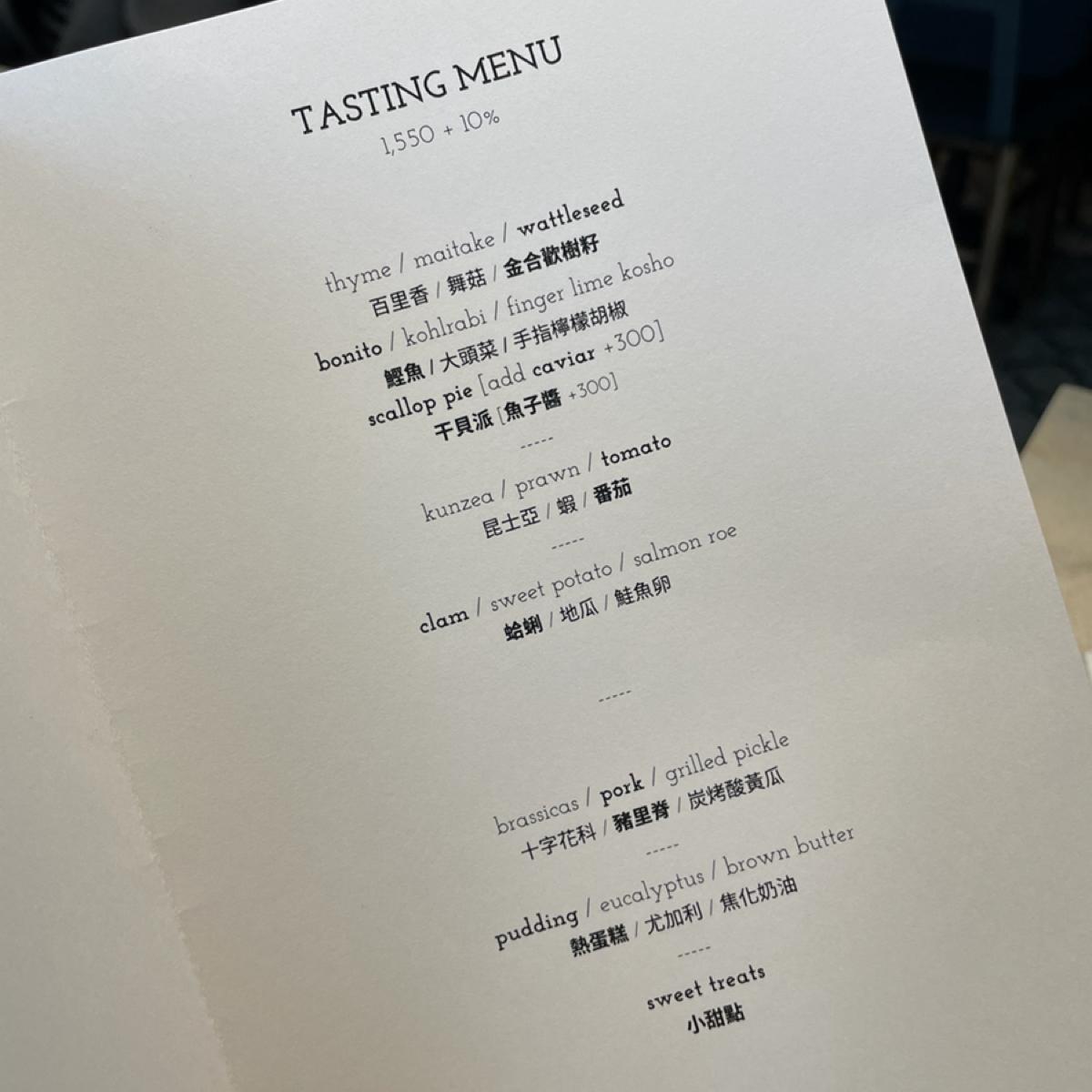 這邊是吃Fine Dining,中午及晚上分別提供兩種價格的菜單,這次是週日中午來用餐,選擇$1550+10%的Tasting Menu,總共有9道料理,我們另外又加點了1份袋鼠肉串($300+10%),每一樣餐點的份量都算精緻,不過有提供麵包及麵疙瘩等澱粉類餐點,所以全部吃完是有飽的