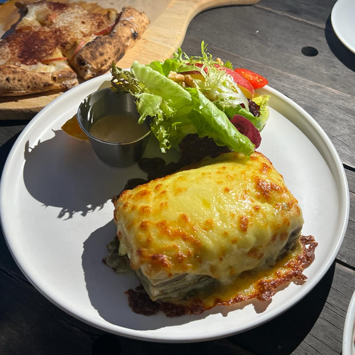 起司烤得金黃焦香,裡面是炒過的香菇跟醬汁,一層層堆起來,味道濃但不膩,吃完會飽。