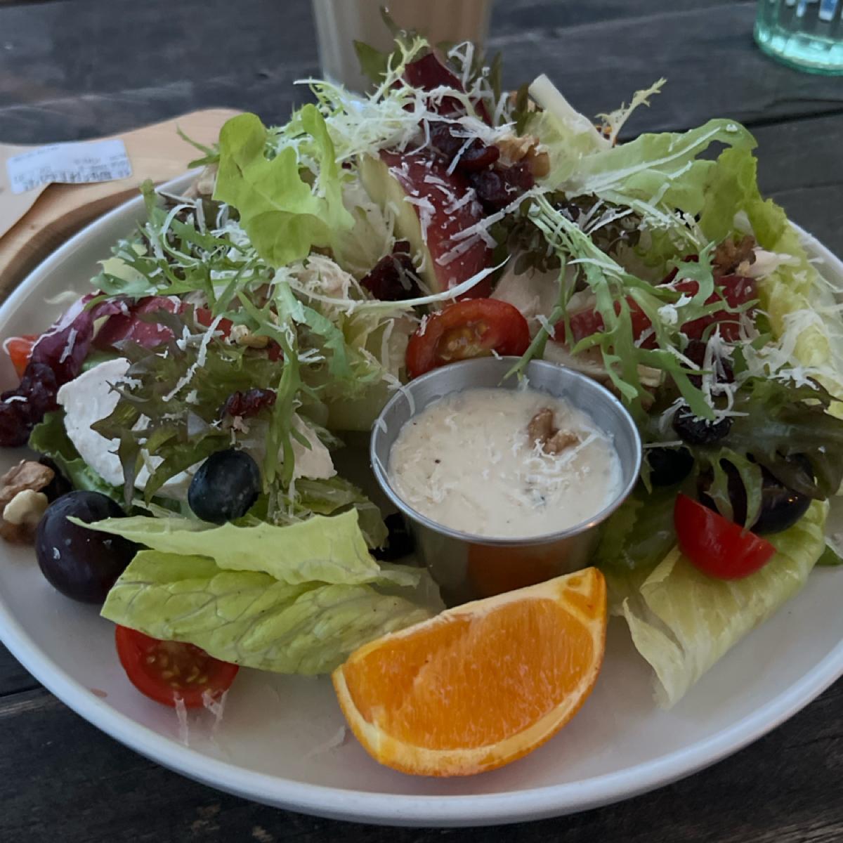 生菜配料滿豐富的,有葡萄、堅果、番茄,舒肥雞胸切得厚實,吃起來不乾,醬是凱撒醬那種。