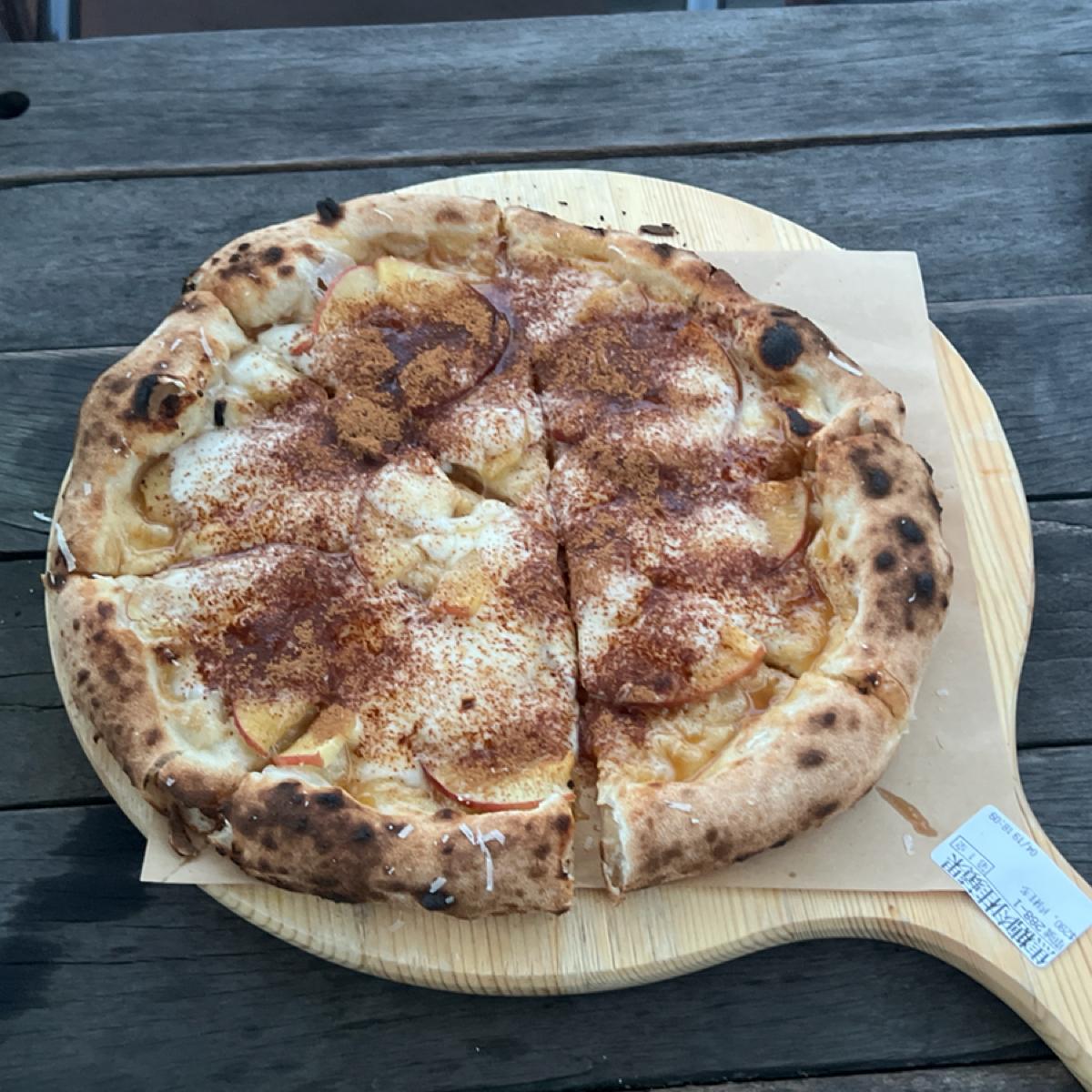 這個是甜披薩,肉桂味重但不嗆,搭配焦糖跟蘋果片,有點像熱的肉桂蘋果派,餅皮還不錯,吃起來蠻特別。