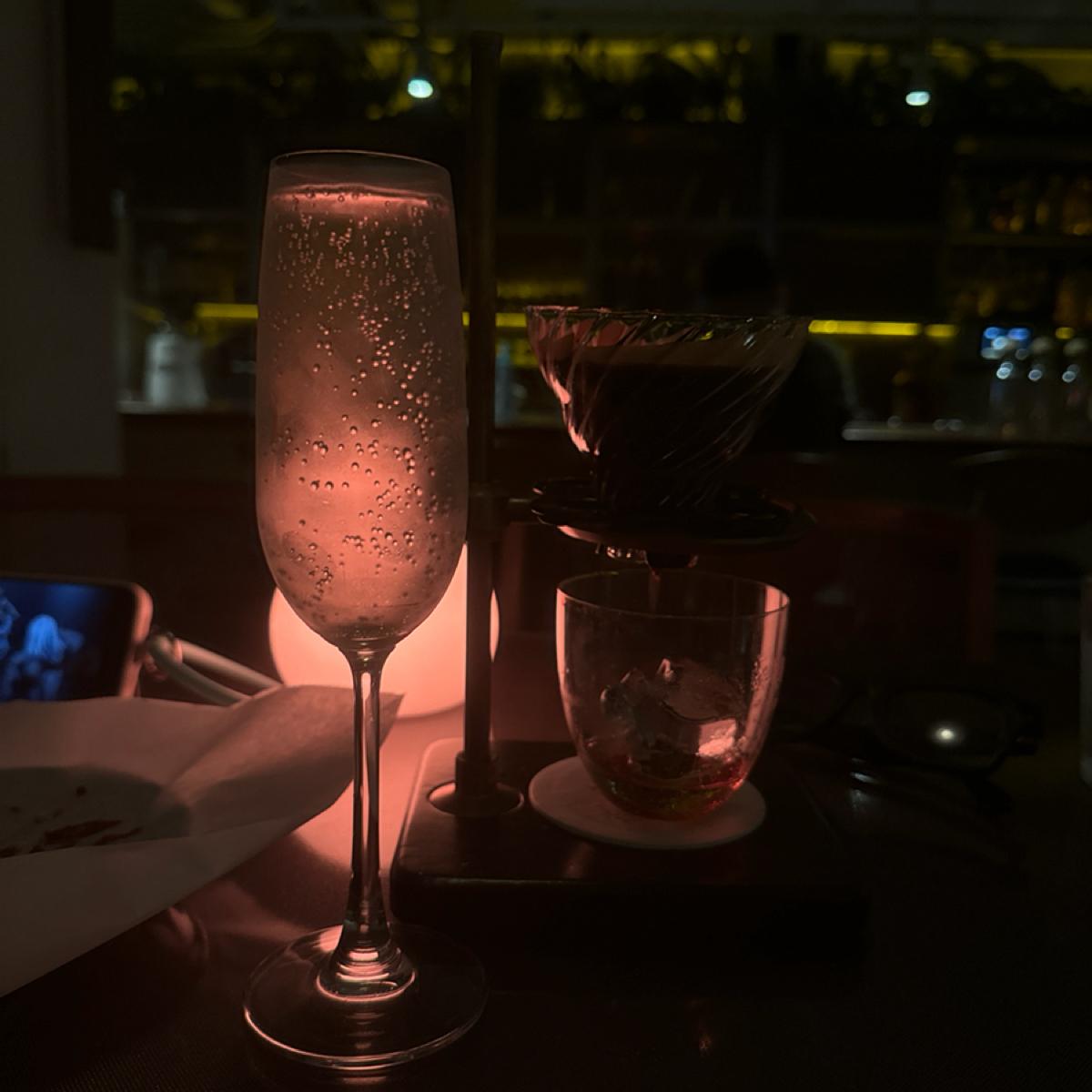 例如我點的是Negroni的變型,眾所皆知,Negroni是由琴酒+Campari+Vermouth調製的,而我這杯則是融合咖啡的要素,去做了一杯很不一樣的Negrnoi,將已經調製好的酒液,以手沖咖啡的方式,流入早已放入冰塊的杯中,讓本來味道很複雜的Negrnoi又多了一絲咖啡味,個人很喜歡。
