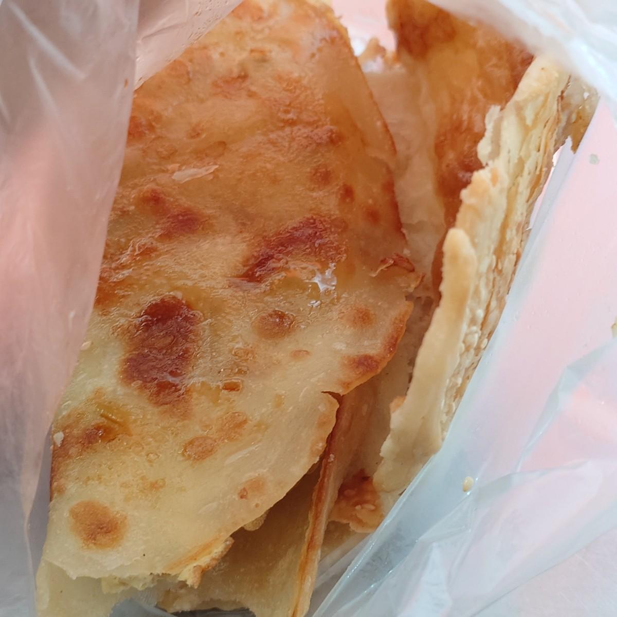 燒餅,咬下去先注意一下衣褲,會掉屑。外:乾、酥、脆。內:鬆、略濕、綿。不論夾蛋、油條、豬排(有點辣)都很讚。