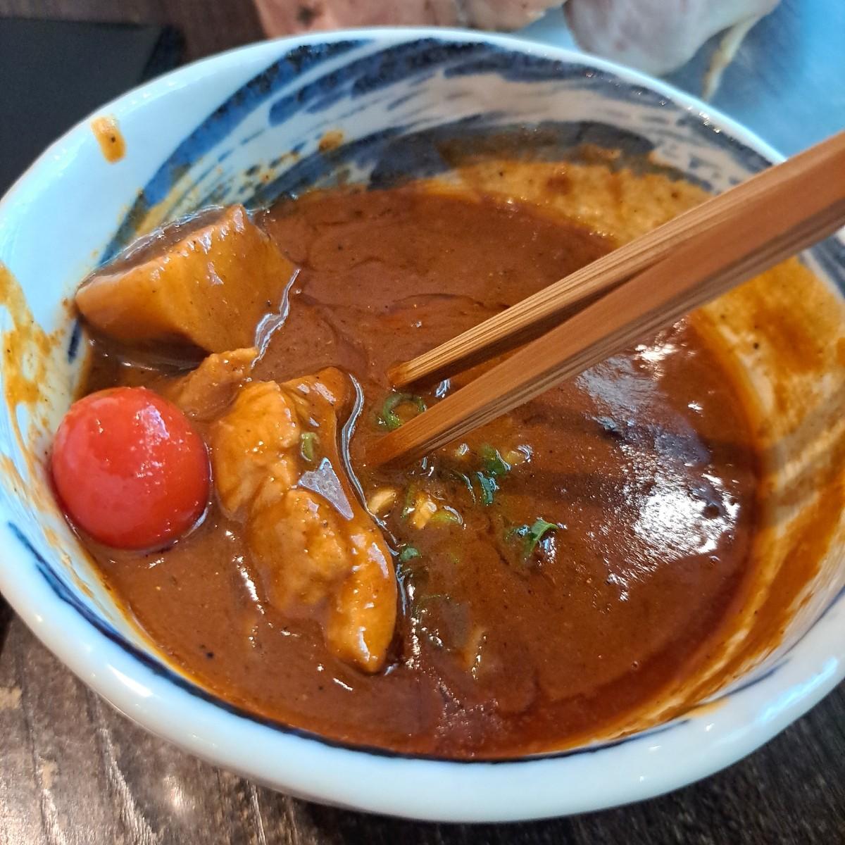 沾麵麵體是稍微粗一點的中捲麵,非常扒湯,口感也很有嚼勁,沾湯本身則真的是超濃厚的蝦味與一點點番茄酸甜點綴,是吃的時候腦袋裡忍不住會想‘’如果有人對蝦子過敏,應該會吃一口就絕頂升天吧‘’的那種濃郁。