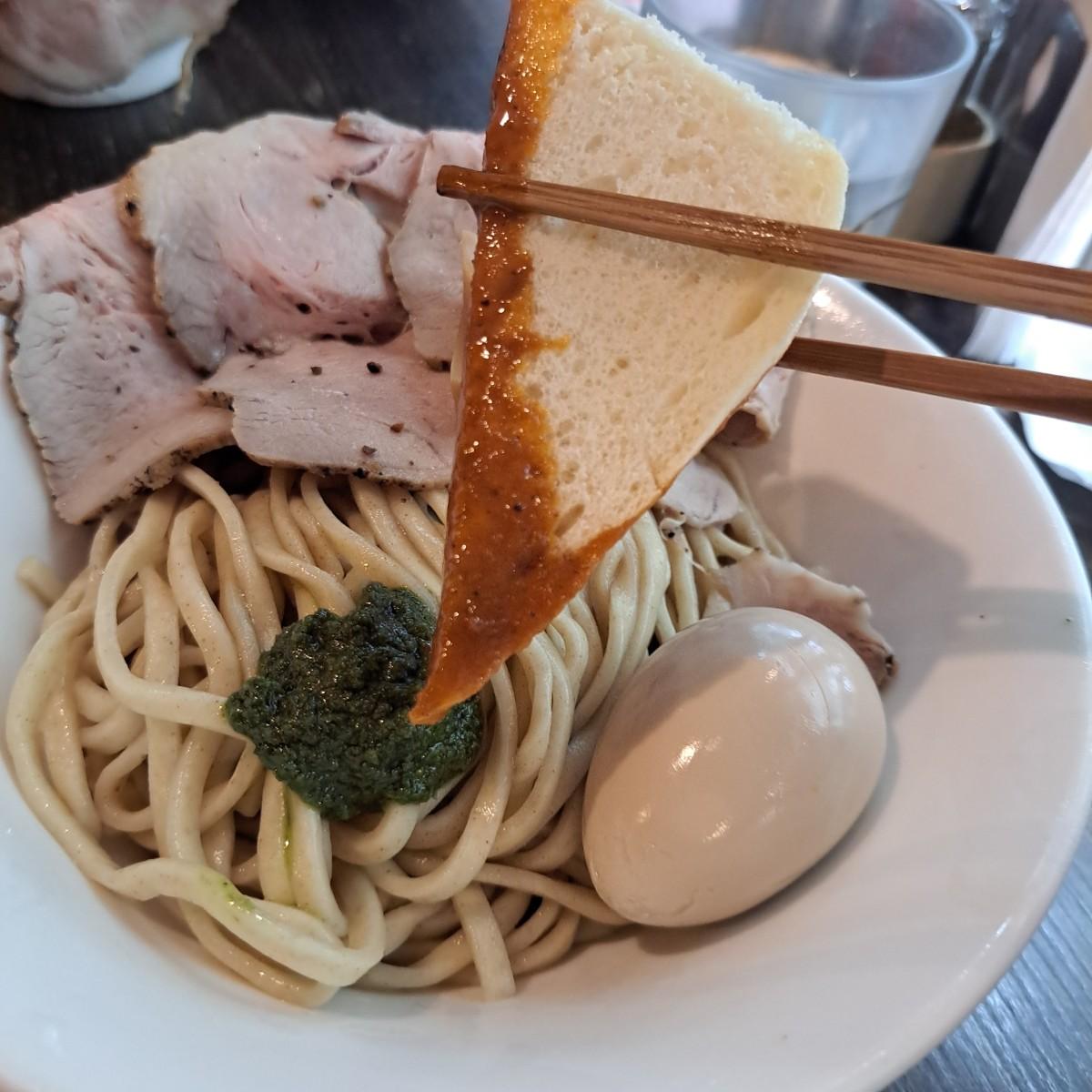 我點的品項全名是濃厚豚骨番茄蝦沾麵,跟經典品項的配置差別在少了高麗菜跟海苔,多了一片法國麵包和一小坨青醬,沾醬裡則多了兩顆小番茄~先說那片法國麵包,很訝異,烤得剛剛好,外酥內軟,不管是沾蝦湯、抹青醬都非常好吃,坦白說當下真想再來一塊🤤