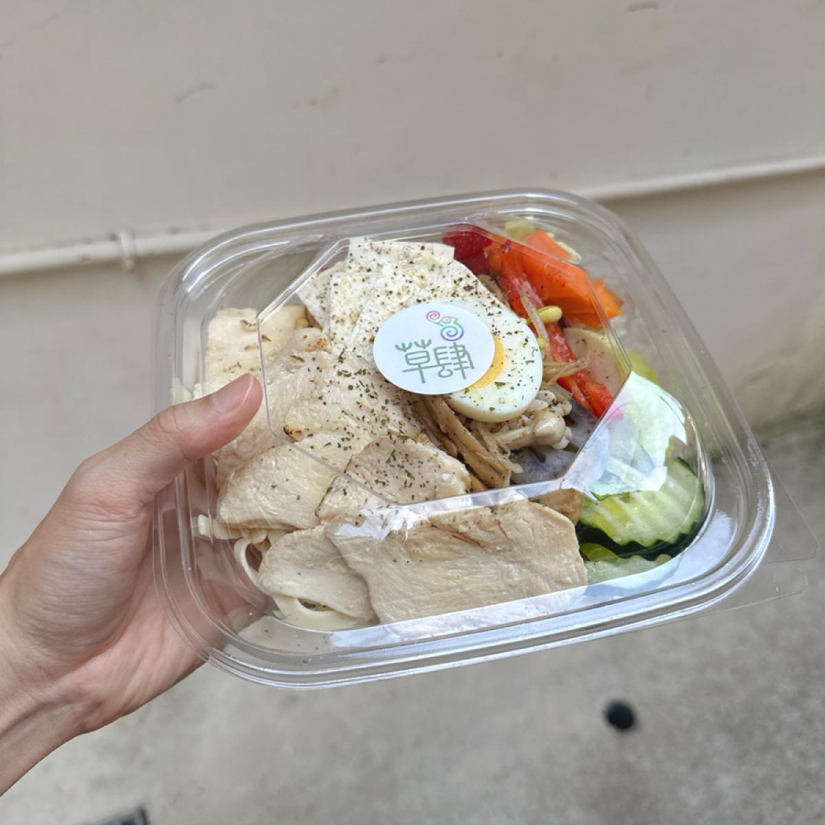 先不談那些優惠,這次點的草肆嫩雞胸沙拉搭配風味油鹽,裡面的生菜每一片都超級新鮮好吃,雞胸是舒肥的,所以也非常嫩;整盆沙拉裡還有多種根莖類、水果、豆腐、瓜類⋯⋯等,隨著每天準備的東西不一樣,每次去也都會有不同的驚喜,我甚至曾經在這裡吃過草莓/鳳梨/火龍果/芒果⋯等不同的水果,超浮誇