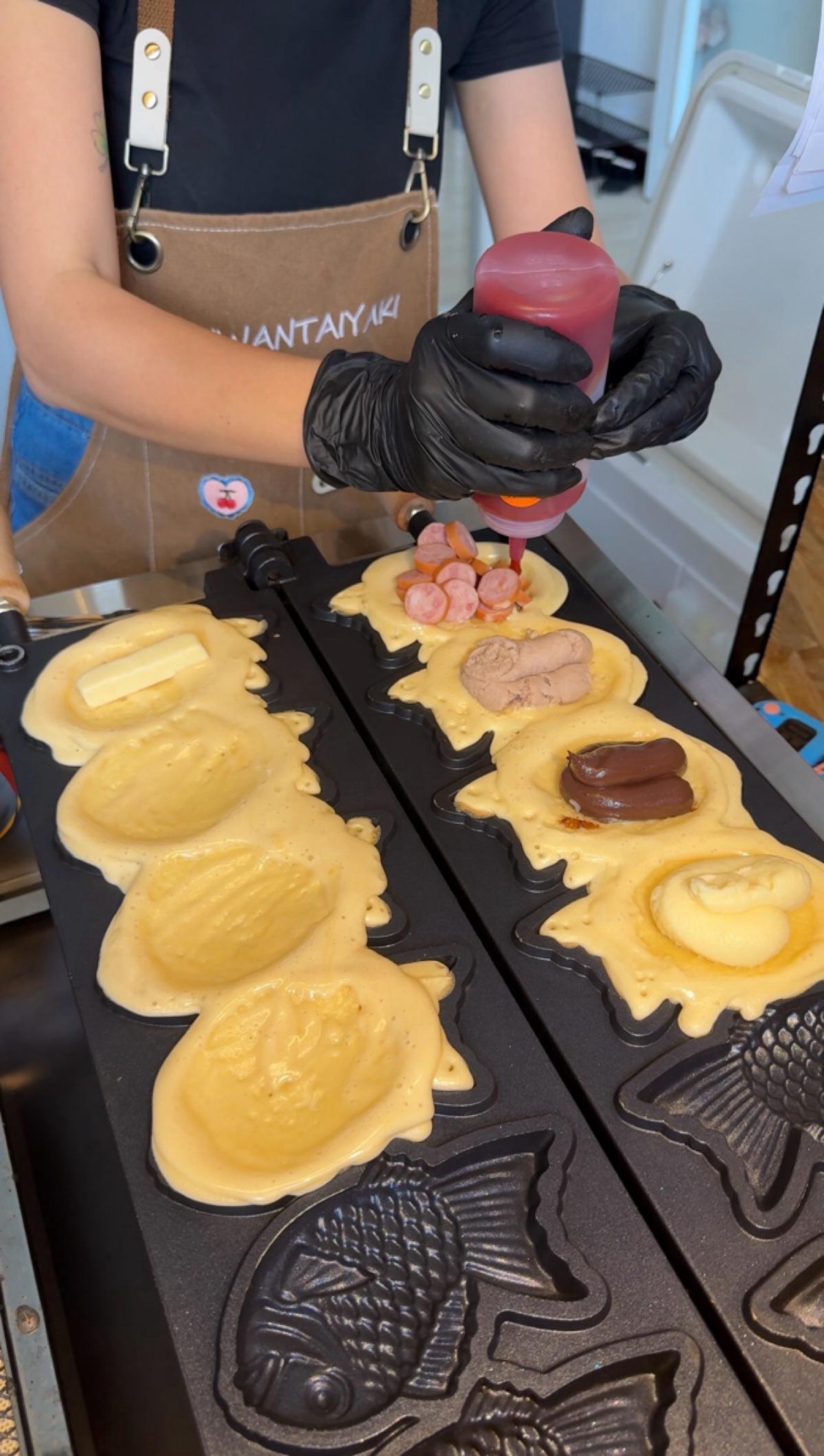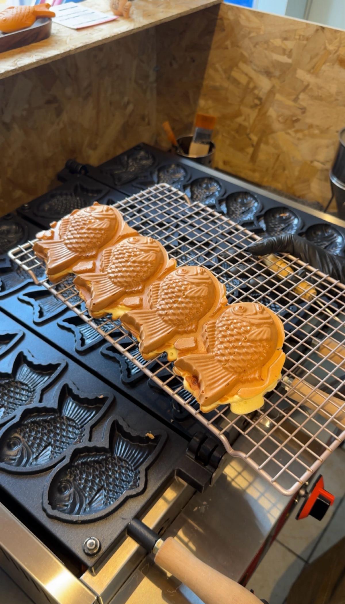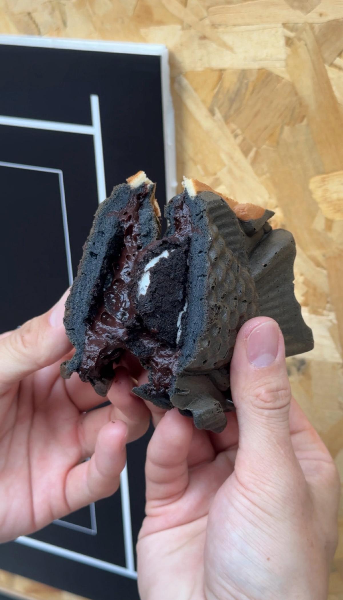鹹食還有德式香腸,一顆就滿足,下午茶吃這個剛剛好。 還有黑色那隻鯛魚燒,夾著 Oreo + 巧克力卡士達,罪惡感爆表但真的很好吃,小朋友一定超愛。