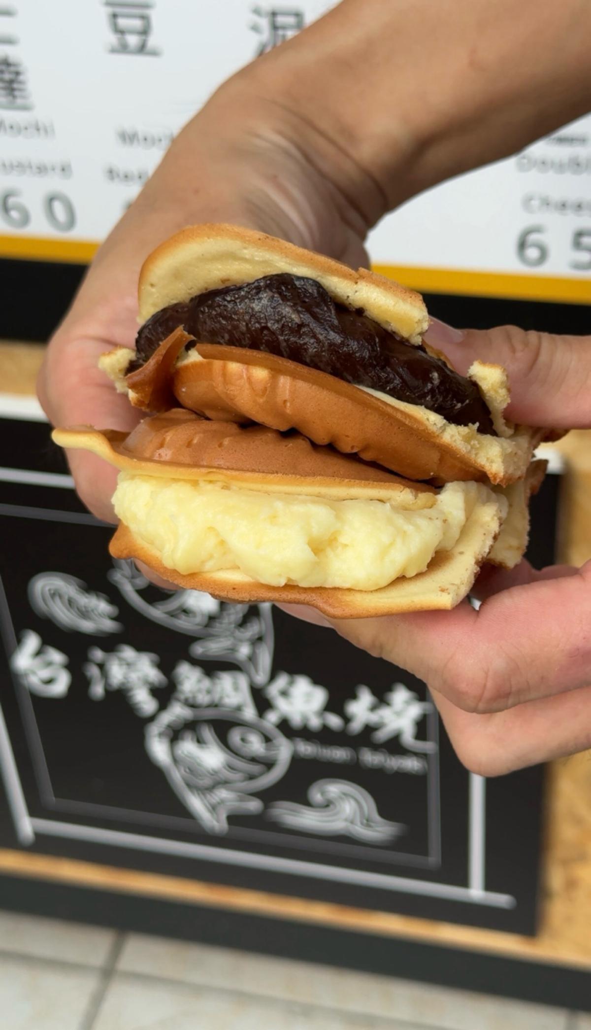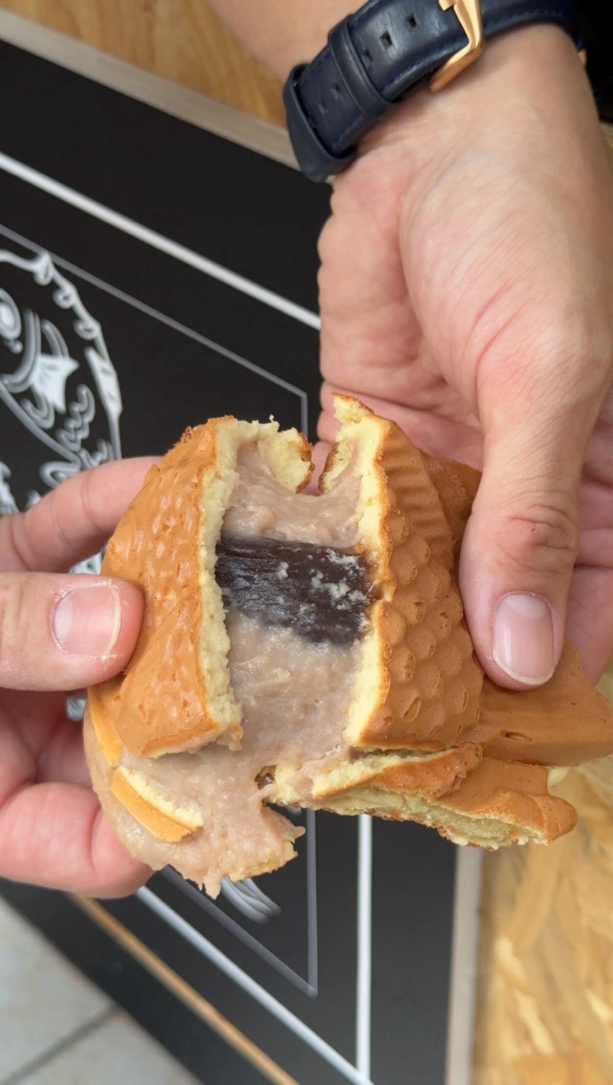 鯛魚燒本尊超大隻,餡料塞到魚嘴都快閉不起來,光看就知道老闆下料完全不手軟。麵皮烤得香香脆脆,芋頭泥超濃超綿,芋頭泥控一定要試試看。