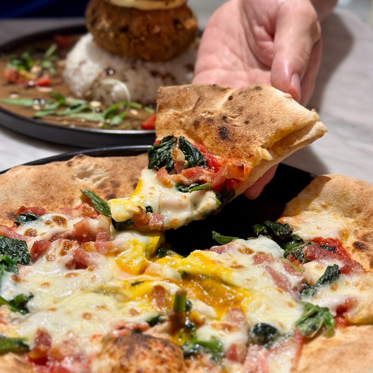 ✅經典菠菜培根半熟蛋:店家手工窯烤,Q彈有嚼勁的餅皮,搭配著軟嫩菠菜、鹹香培根與靈魂的半熟蛋,讓整個滋味充滿層次。就算是放冷了,披薩一樣美味。