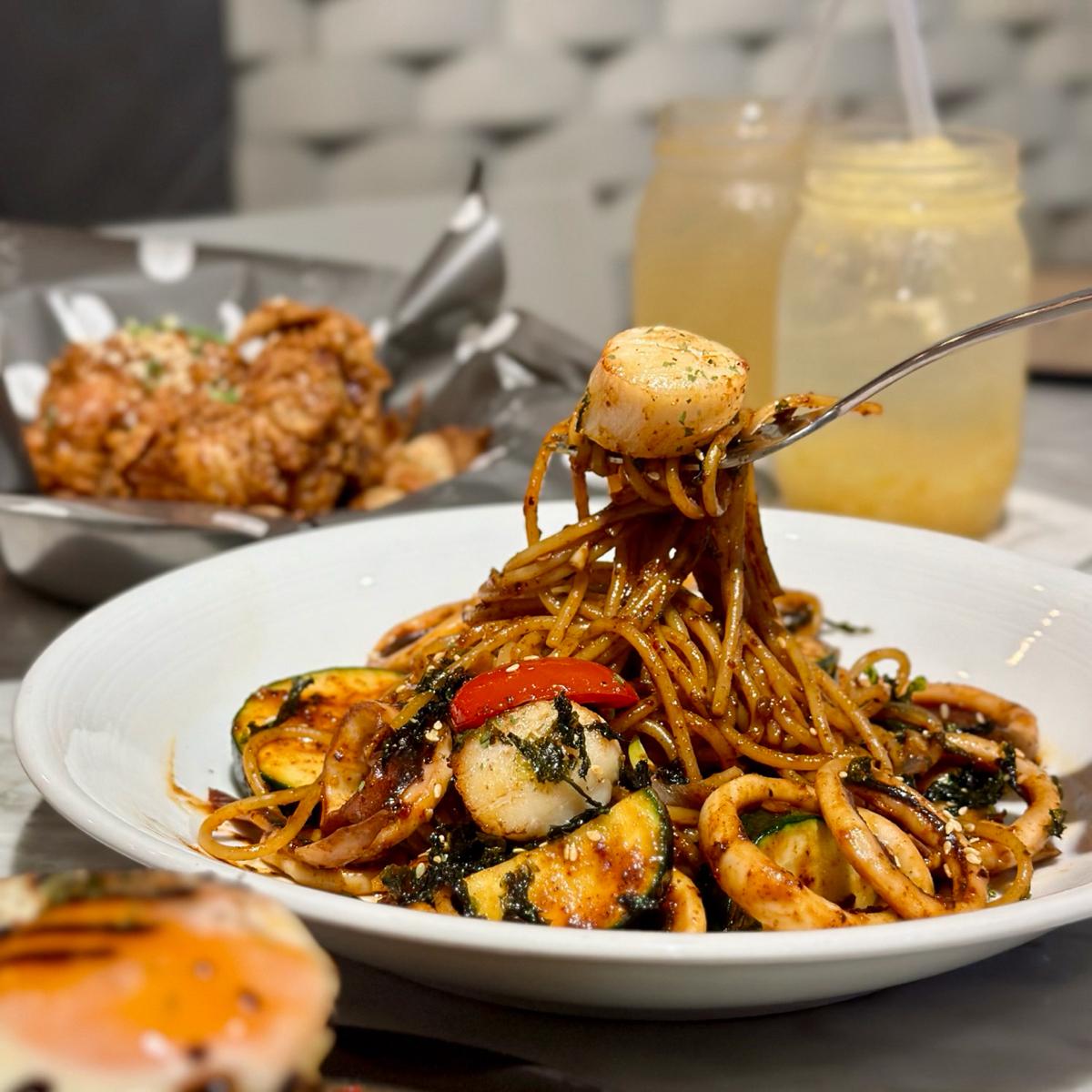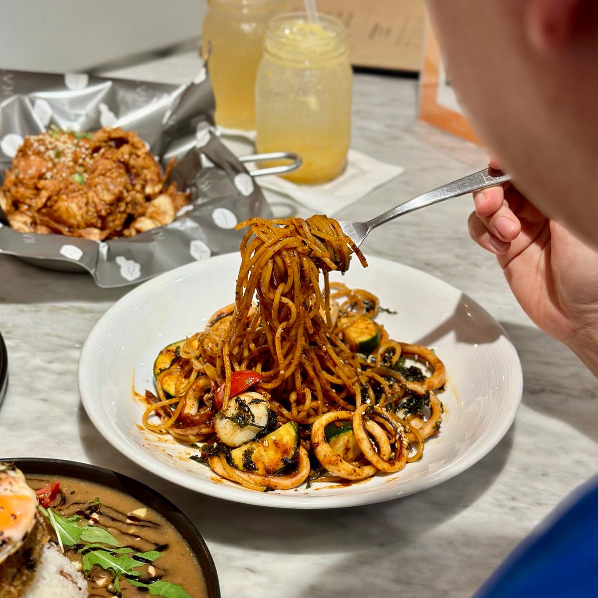 ✅韓國辣醬魷魚干貝義大利麵:這道料理以韓式辣醬拌炒魷魚、干貝、櫛瓜、番茄和洋蔥,完美融合了韓式香料的辛香與海鮮的鮮甜。麵體保留了一些口感,讓整體口感與風味層次更加突出。