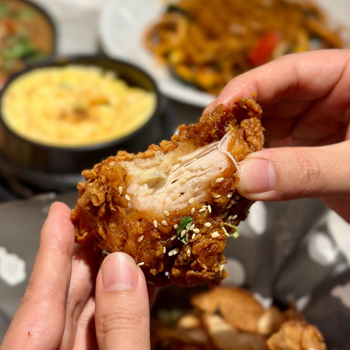 ✅蒜香奶油鹹醬炸雞:炸雞充滿了鹹香滋味,雞肉先炸再裹上醬汁,外皮並沒有想像中軟掉,反而保留了酥脆度,吃起來甜香酥脆。另外下方還有炸馬鈴薯切片,吃起來非常有口感,就算是冷了一樣非常酥脆、好吃。
