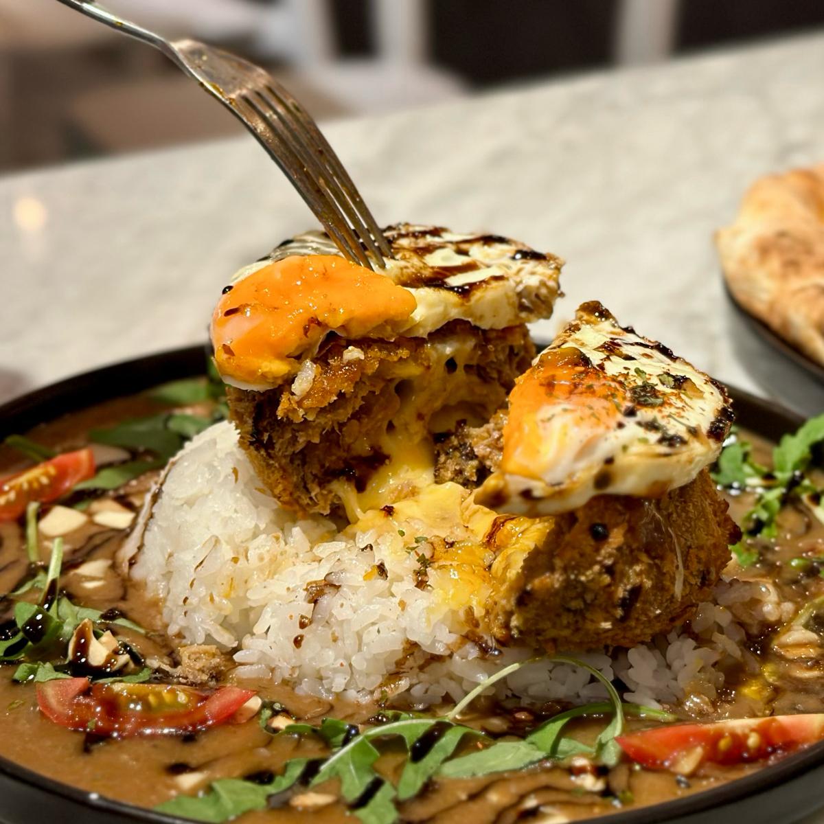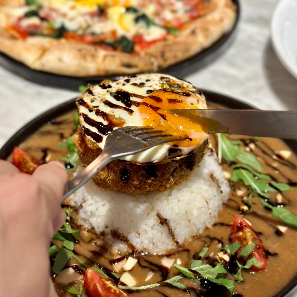 ✅漢堡肉排飯:漢堡肉以牛肉和起司製成,吸睛的外觀也是IG上的熱門打卡美食。搭配紅酒醬汁、芝麻葉、小番茄和半熟蛋,味道層次豐富。醬汁溫和微酸,和芝麻葉的搭配相當巧妙。切開多汁的漢堡排,內裡藏著濃郁的牽絲起司,每一口都能感受到風味與口感的完美堆疊。這道菜是吃曼的最愛,也是最推薦的一道。
