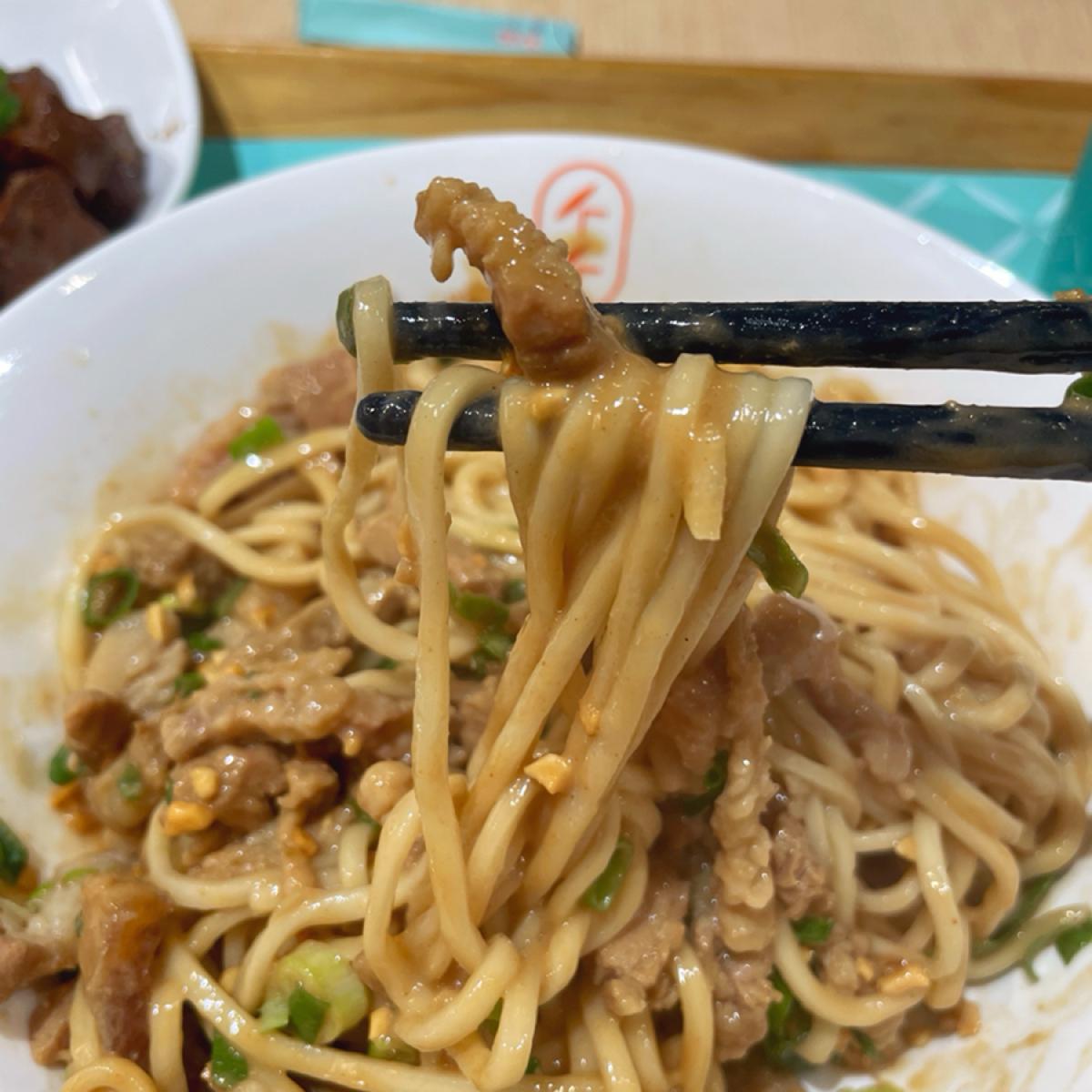 麵很Q有彈性,份量足,肉絲、花生碎、蔥都給很足,每一口都很享受。