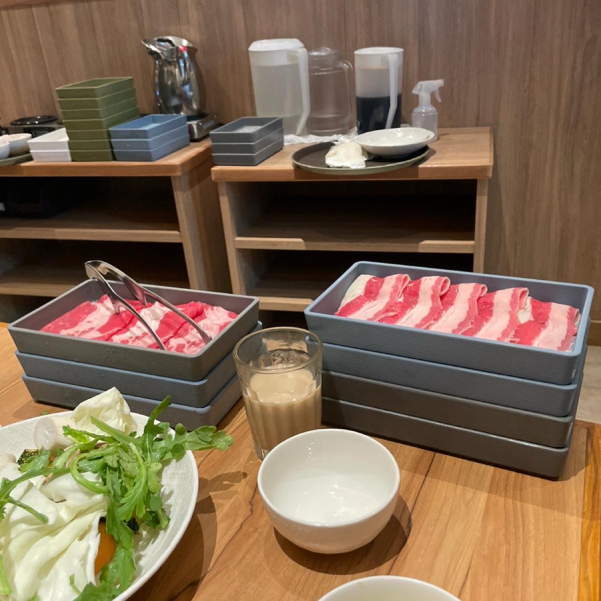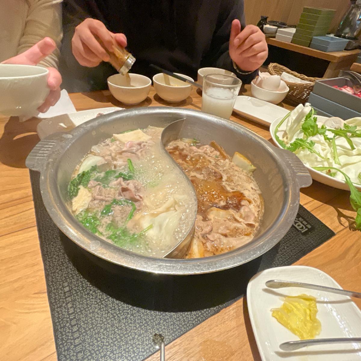 用餐方式是90分鐘的吃到飽,價格分為平日午餐:一種湯頭469/兩種湯頭519;晚餐及假日:一種湯頭629/兩種湯頭679,我們選了壽喜燒跟鹽味豚骨鍋,我個人喜歡壽喜燒大於豚骨,下次如果有來想嘗試別的口味。