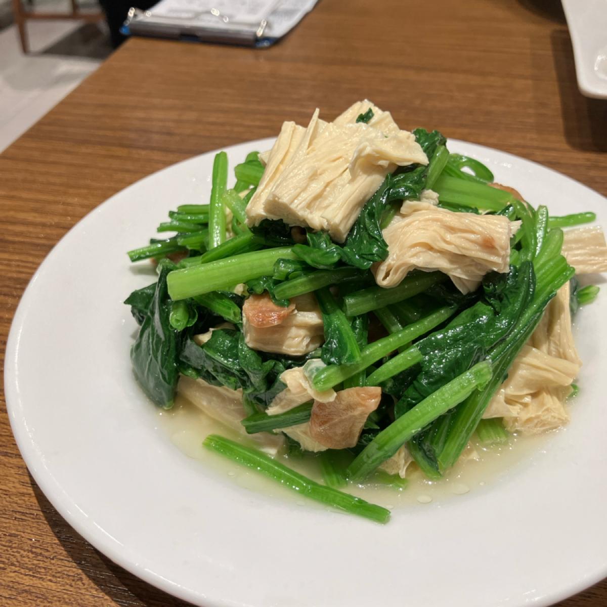 最後是必點的菠菜腐竹,紹興酒和蒜頭的調味堪稱一絕,讓菠菜染上另一種鍋氣,搭配腐竹的口感,提升整道菜的層次和口感。