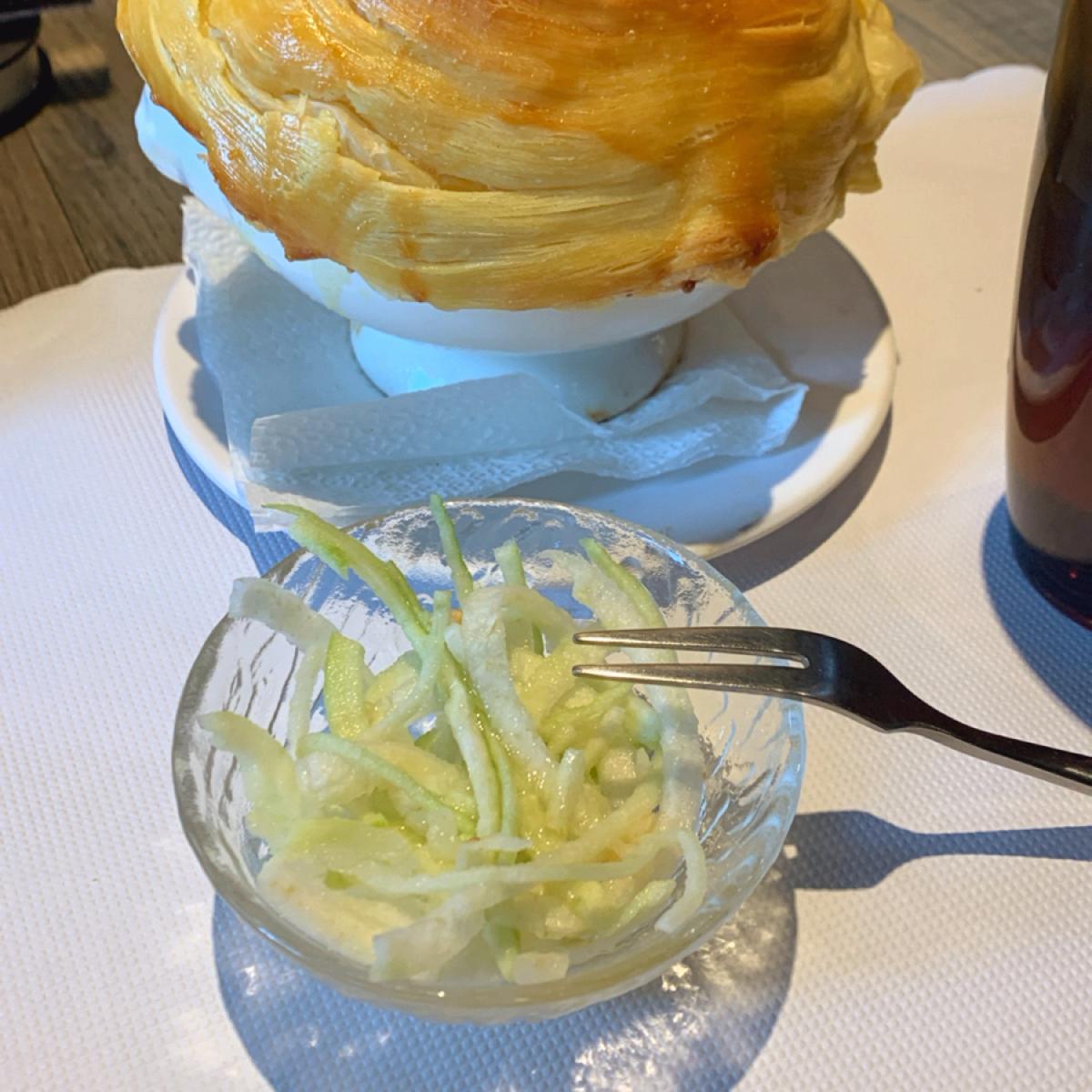 點完後很快就送來開胃菜,油醋芭樂絲意外好吃,女兒秒吃完,接著上來我心心念念的酥皮濃湯(小時候去夜市吃牛排的回憶),我本身喜歡酥酥口感,是走酥皮僅浸泡一下的路線,所以都是邊吃邊把酥皮壓入,吃完我已5分飽🤦♀️