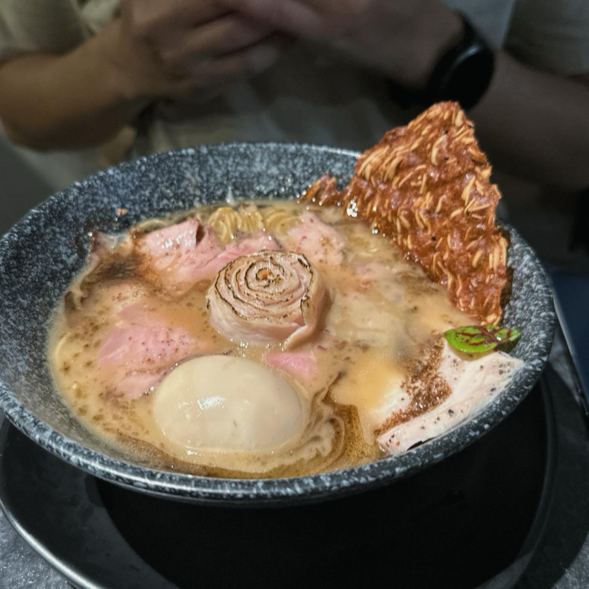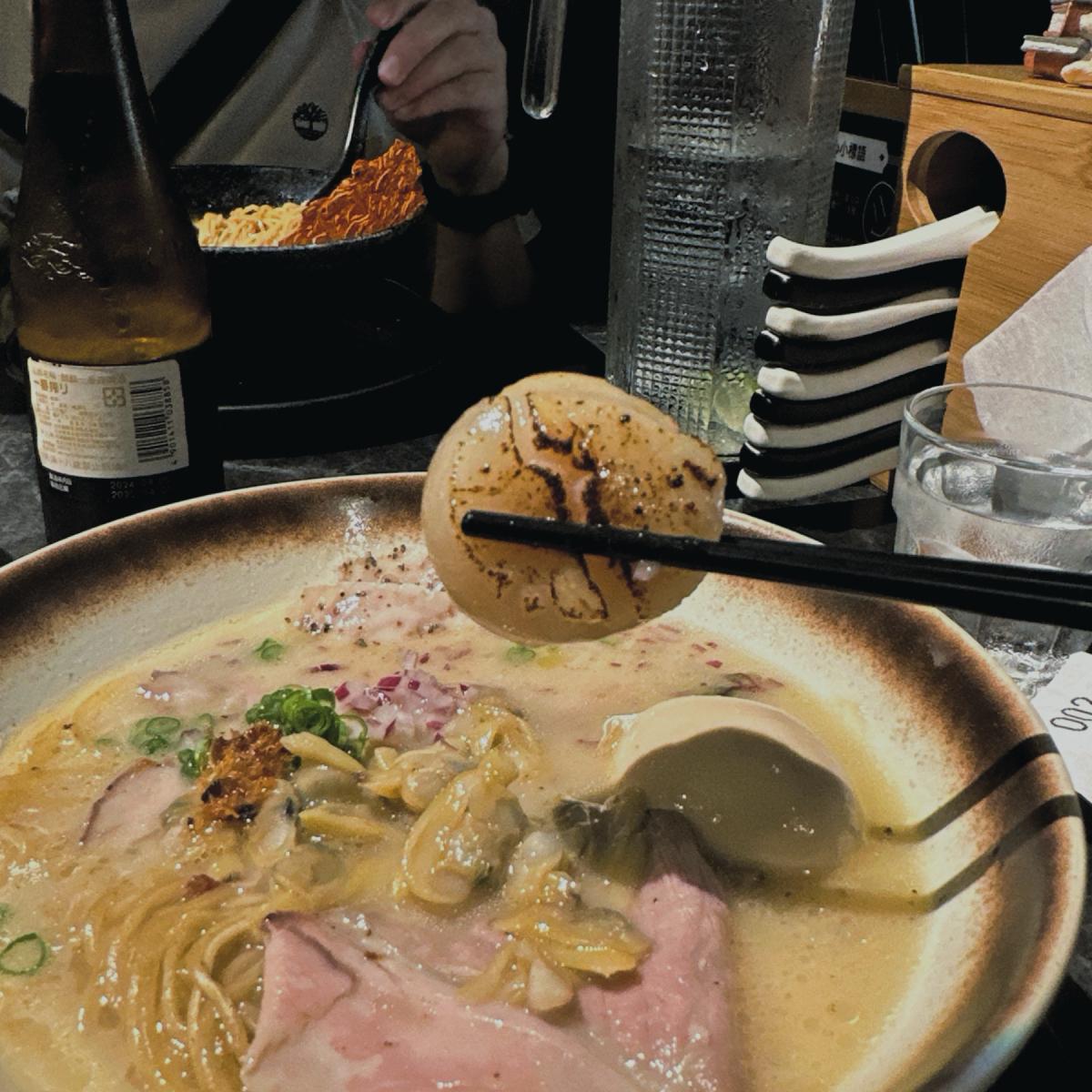店內的招財貓裝飾滿可愛的,為用餐氛圍增添了不少趣味。我點了他們的招牌「特級 • 白松露雞魚貝拉麵」。一端上桌,白松露的香氣就撲鼻而來,乳白色的湯面上漂浮著調味的油花跟一整顆炙燒大干貝,喝下第一口湯,鮮甜的魚貝味立刻在口中綻放開來,隨後是濃郁的雞湯尾韻,清新而不膩口,讓整體湯頭更有深度,很喜歡!
