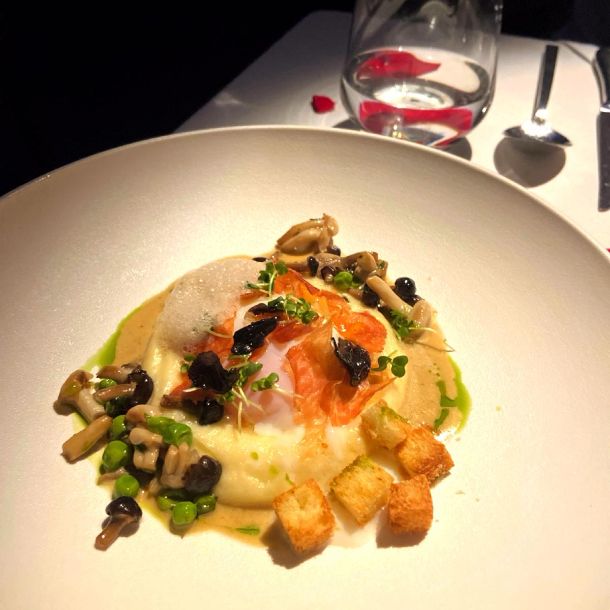 -分子料理溫泉蛋配西班牙火腿及黑松露炒蘑菇