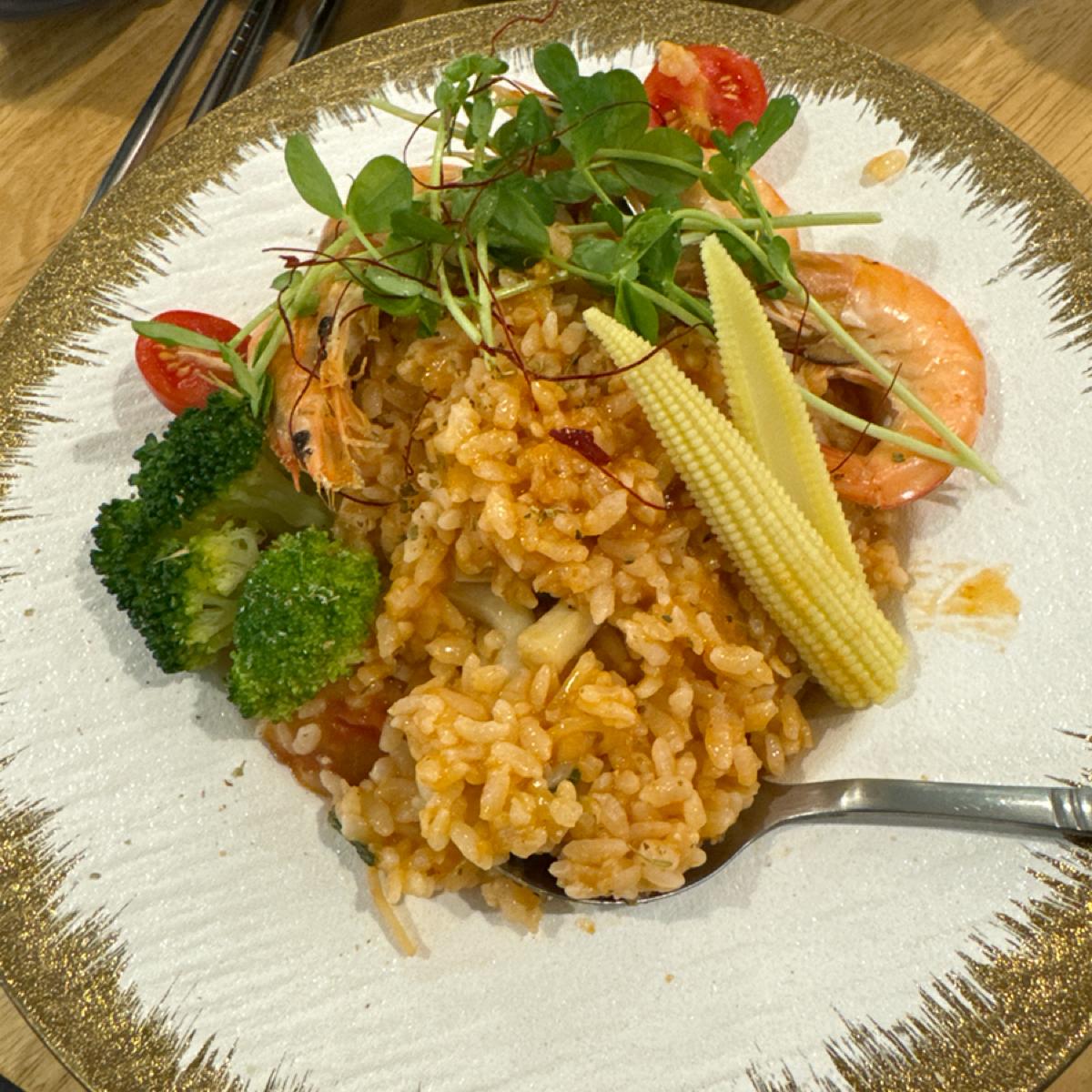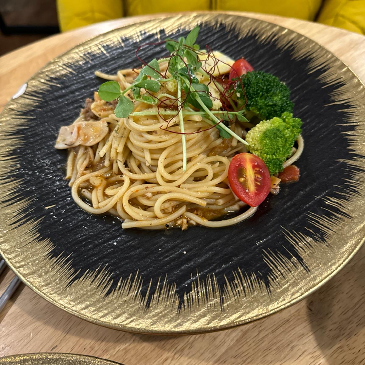 在超商旁邊的咖啡店,隔壁二樓是包場用的場地,一般用餐是在一樓。平日中午去幾乎客滿,意外的餐點種類還算多,口味也還行。