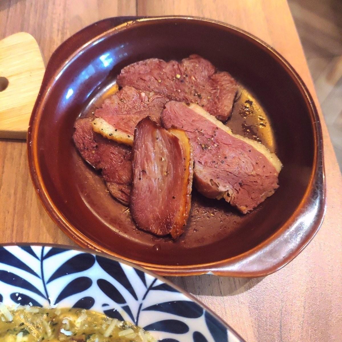 3.蒜香香煎鴨胸肉義大利麵 260元,搭配上義大利麵的青醬羅勒味很濃郁,加上三分熟的蛋黃真的很讚,可惜的是鴨胸肉感覺有點太薄導致有點乾,可能是太想念西堤的鴨肉了,覺得這部分可以再加強!