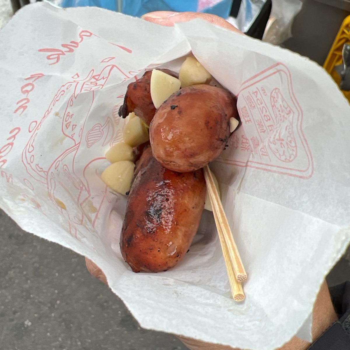 超級好吃的炭烤香腸配蒜頭,只有基隆廟口才敢給這麼多蒜頭🧄,五顆香腸吃完了紙袋底下還有一層蒜頭,是想要臭死誰😂