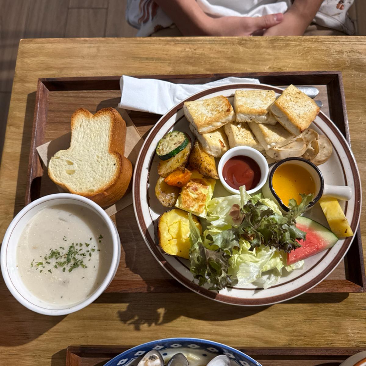 最後是友人點的無肉豆蔬包早午餐(素食),他的回饋是很好吃,從生菜、水果以及豆腐主食都有,相當豐富,配色也很舒服,是厲害的蔬食