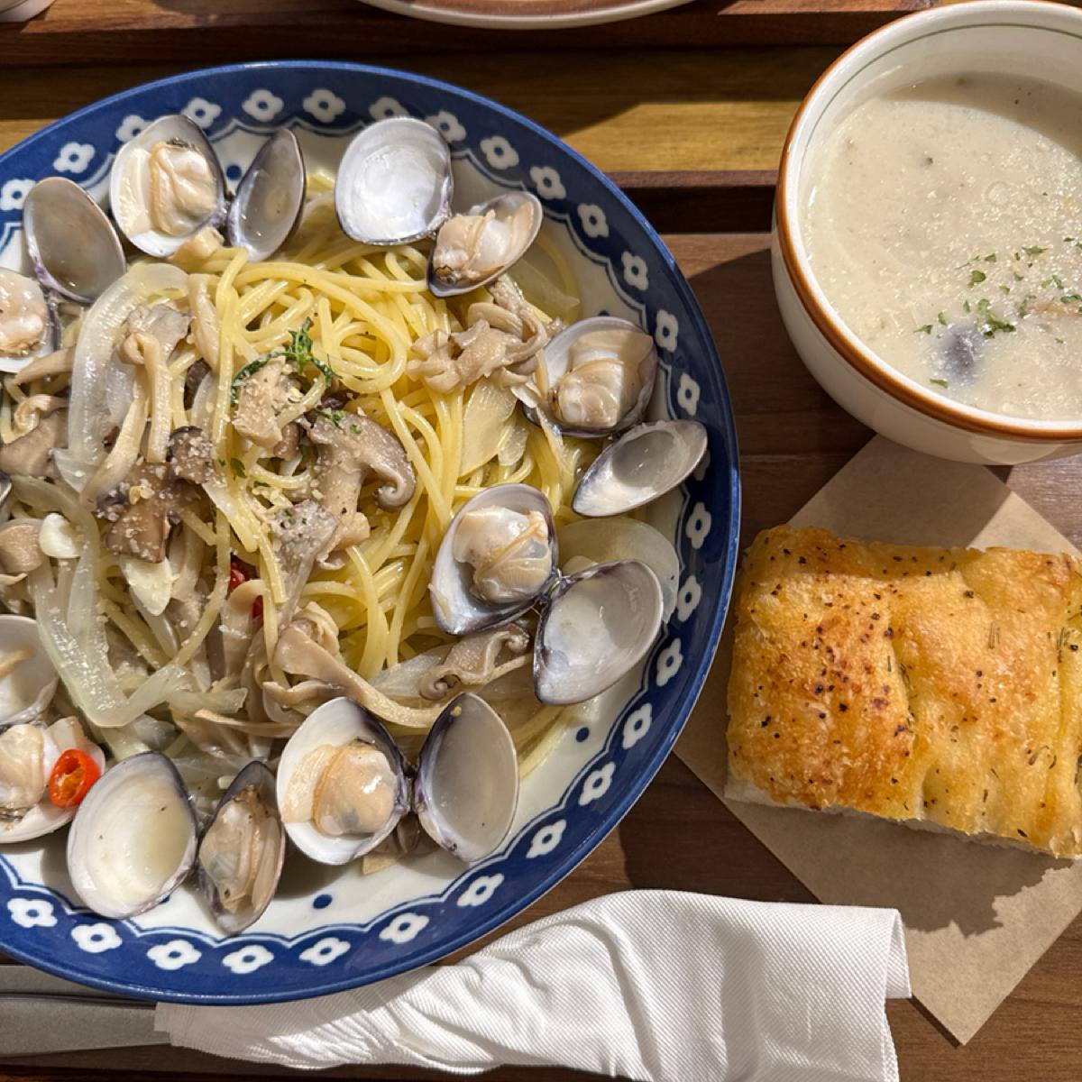 不僅如此,我的白酒蛤蜊義大利麵也是一樣的下場,蛤蜊飽滿美味,但麵就是有那個難以理解的甜味,我真的不太明白⋯