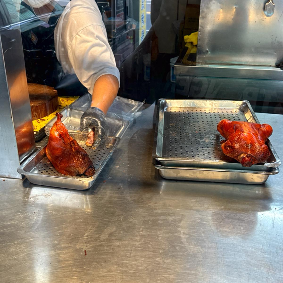 這現烤烤鴨皮脆肉嫩❗️香氣十足,不用調味單吃就很夠味了,但店家還是會附贈一包胡椒鹽給重口味的人,而根本也來不及放上來展示就剁出去給客人了😊