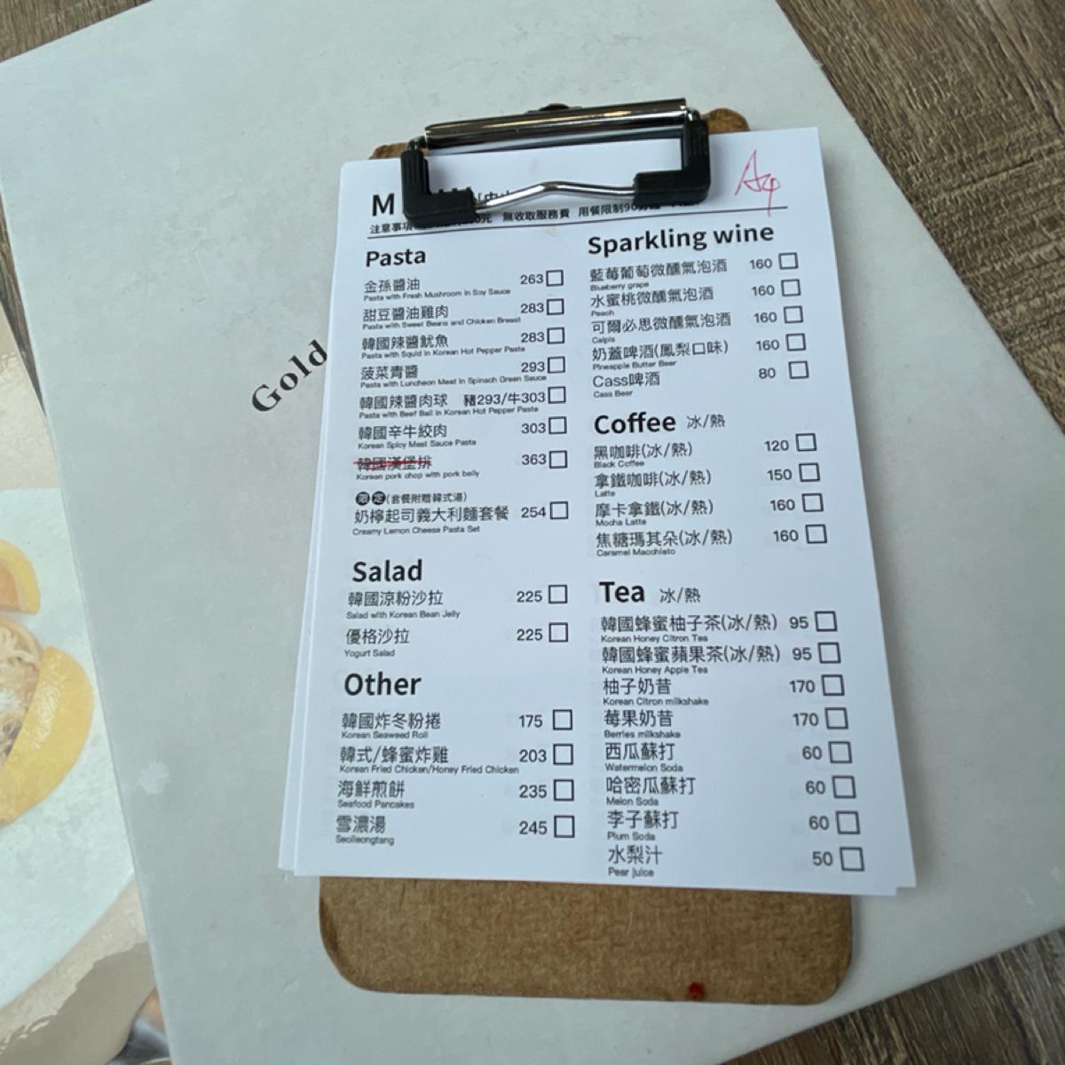 主要販售以韓式口味為主的義大利麵,另外還有沙拉、炸雞、雪濃湯,餐點選項沒有太多,低消250元。