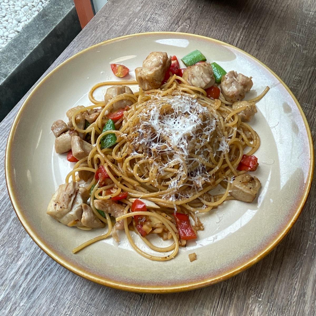 友人點了甜豆醬油雞肉義大利麵,雞肉不柴,吃起來是韓式調味,有一點點小辣,比起來我比較喜歡這個麵。
