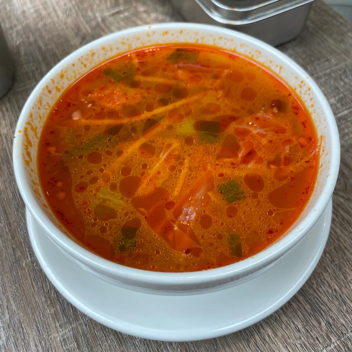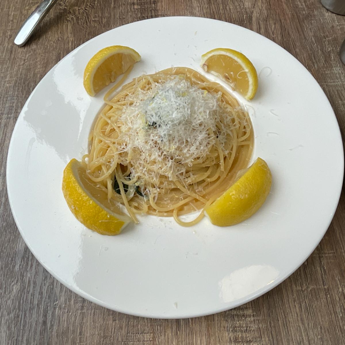 點了應該是期間限定口味的奶檸起司義大利麵,感覺是清炒義大利麵再加上檸檬跟起司,吃起來是明顯的檸檬跟起司味,整體吃起來清淡,我把旁邊四個檸檬都擠汁進入麵裡變太酸,不是我的菜,有附贈一碗韓式泡菜湯,這個我比較喜歡,湯味道蠻剛好,裡面還有Q年糕。