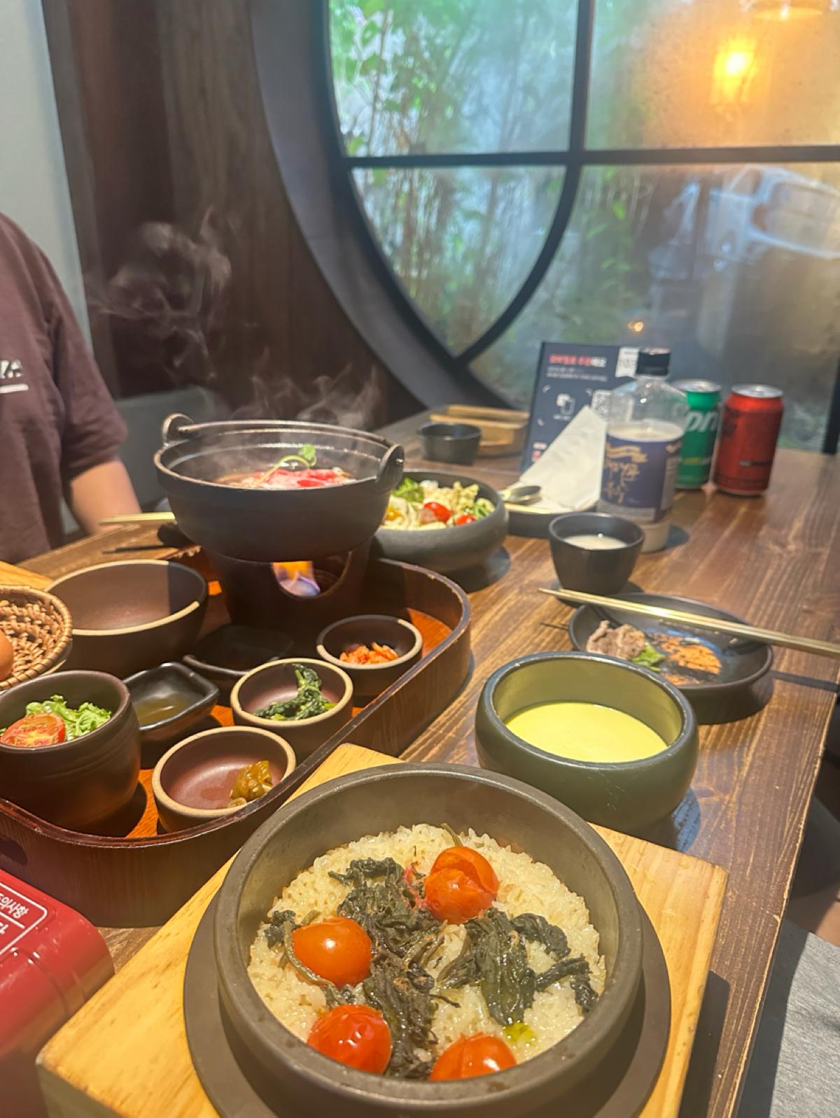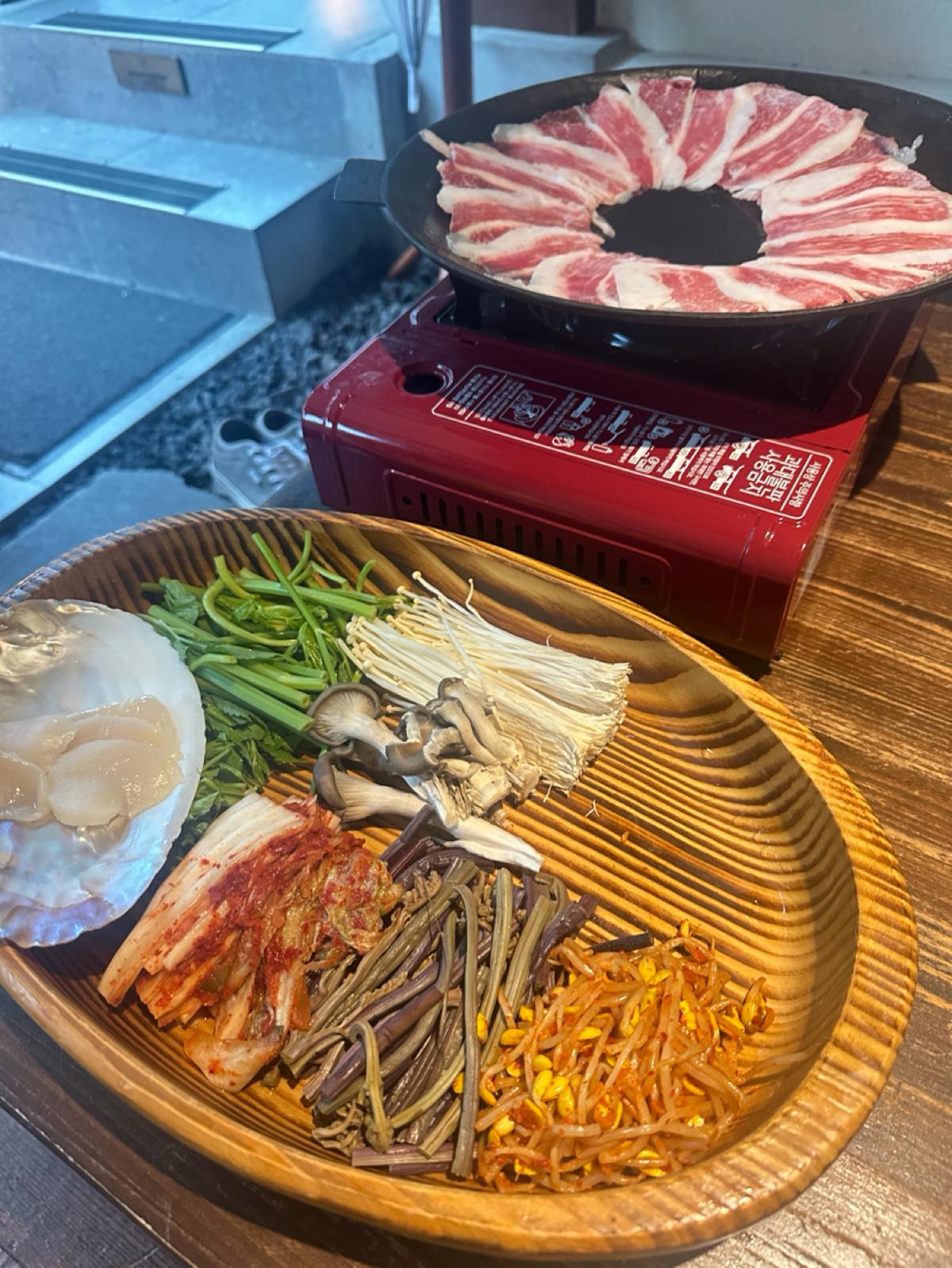 套餐可以選擇兩款釜飯🍚看喜歡簡單的只有九層塔🌿和蕃茄🍅或是喜歡牛肉,甚至其他口味也都可以加價挑選!然後套餐還包含了一個石鍋烤肉,烤肉和菜的部分會由服務人員為我們烤好,配菜不足的部分也可以跟他們多要一些,但是這個雙人特餐的份量已經很足夠,我跟友人兩個人吃的超飽不說,還根本吃不完!