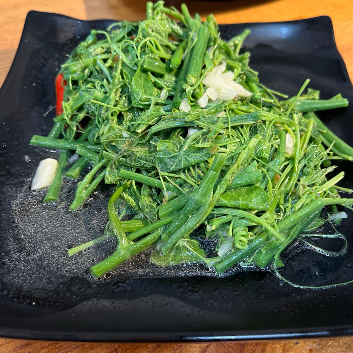 這次點了幾道經典熱炒:蔥蛋、情人的眼淚、龍鬚菜、蔥爆牛肉。蔥蛋看似簡單,卻能吃出功力,蛋香濃郁、口感蓬鬆,蔥量給得大方,每一口都帶著自然甜味。情人的眼淚(雨來菇)處理得相當清爽,口感滑嫩中帶點脆度,調味不重,能吃到食材本身的風味。龍鬚菜火候掌握得宜,翠綠爽口,不會過老,帶著淡淡蒜香,非常下飯。
