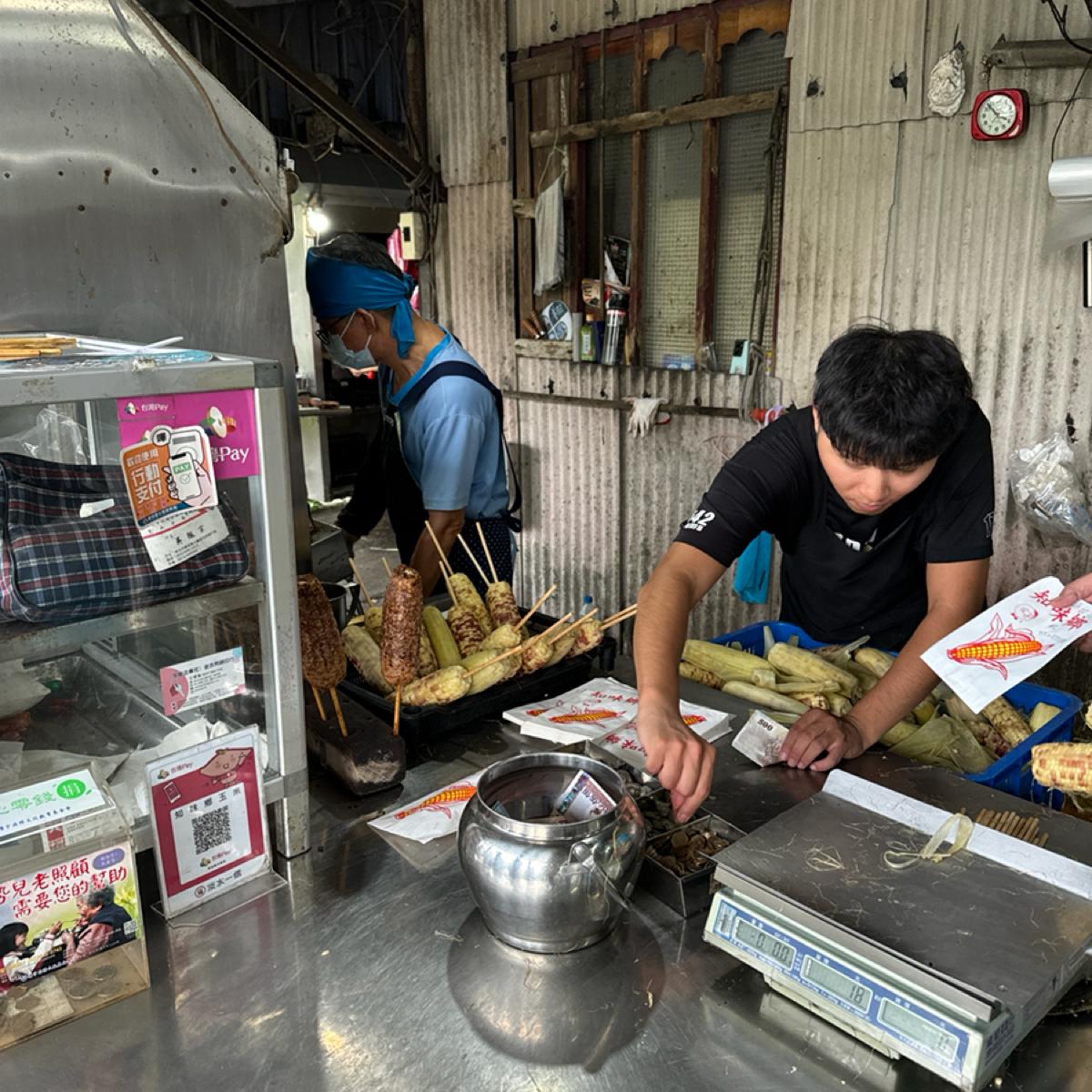 排隊點完烤玉米後,店家會詢問要大隻小隻、喜歡什麼樣的玉米口感、是否需要加辣,蠻特別的是會直接以玉米秤重出來的價錢來當號碼牌