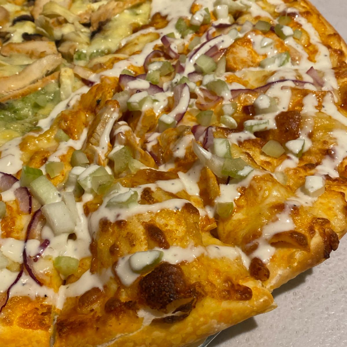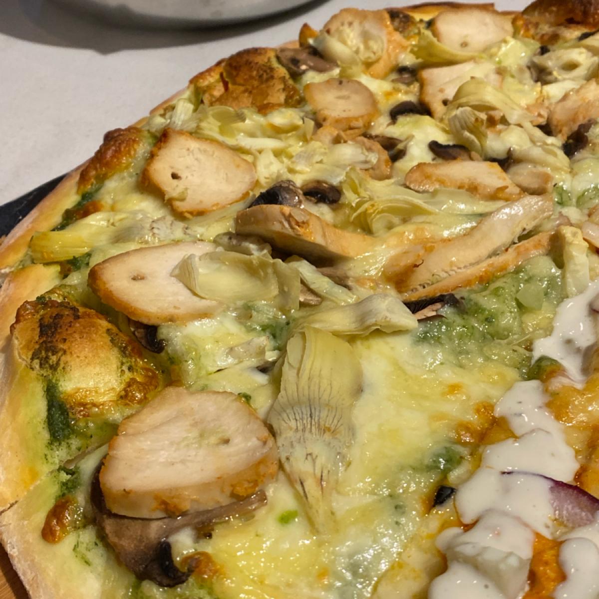 是13吋的大披薩(看估狗評論說的)很貼心的可以選雙拼,挑了兩個口味,我覺得都搭配的蠻不錯,料雖然不是超多但跟起司還有披薩的皮比例剛剛好,我最厲害的是他的披薩皮很好吃,是現烤的手工披薩,是厚的類型卻又不會太厚,吃不完外帶回家再加熱也很好吃,推推。