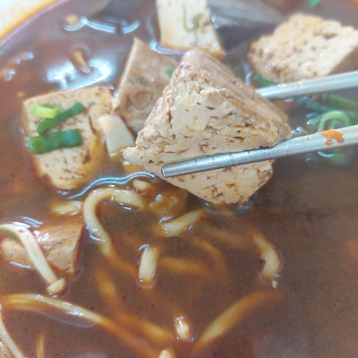 臭豆腐是傳統的切成四方形的類型,質地細嫩,多孔吸湯,配上濃郁的辣湯相當美味。