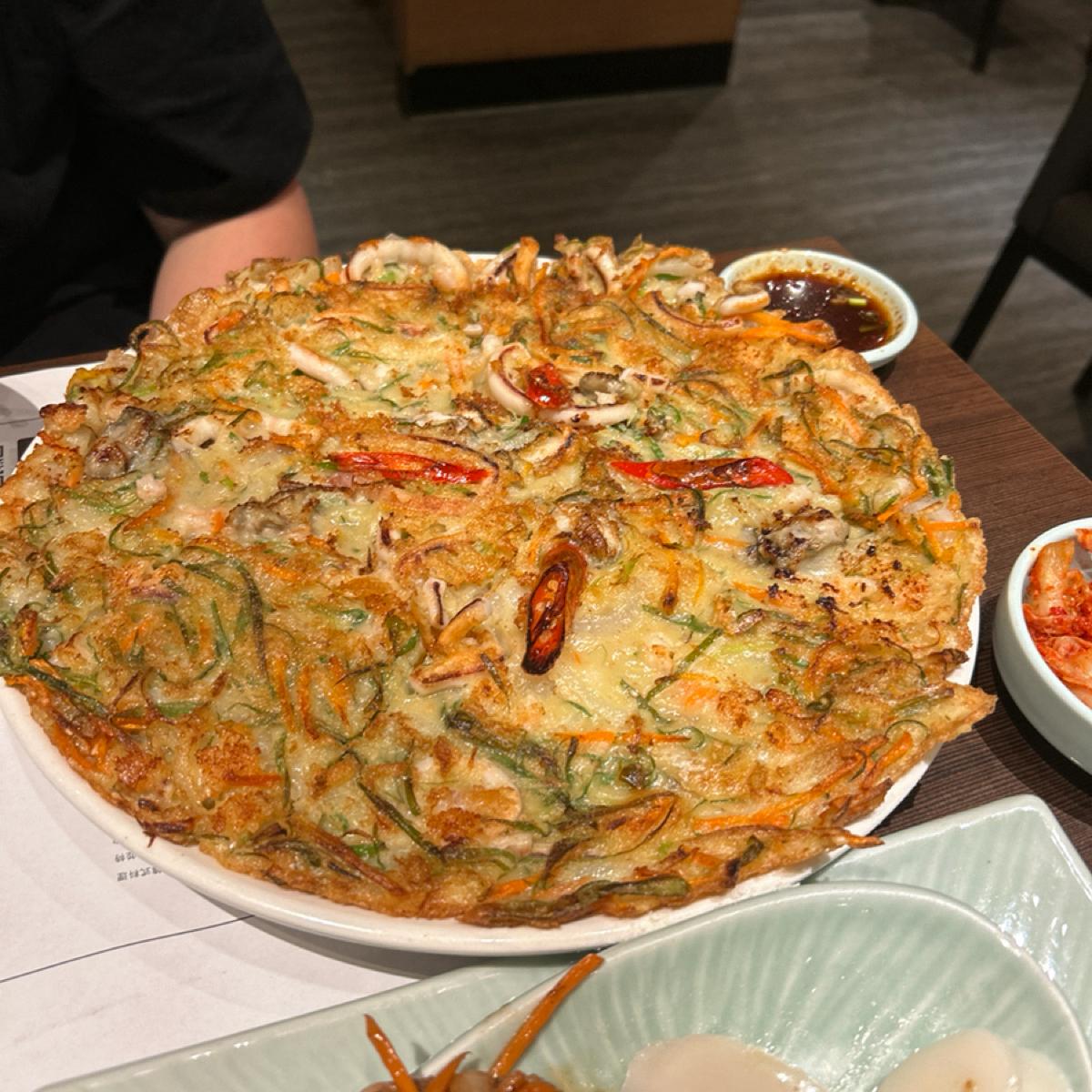 ▫️ 綜合海鮮煎餅有分厚的及薄的,我喜歡脆脆的口感所以選擇薄的,裡面的海鮮及其他料也都給很多,搭配沾醬吃更好吃‼️