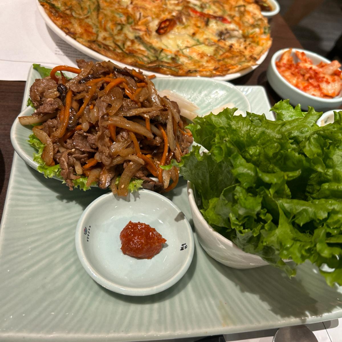 ▪️ 醬燒青蔥牛五花旁邊白白的是年糕,還會附生菜及蒜頭那些,可以搭配著一起吃,因為提供的肉類都是五花,吃起來會比較油,非常需要解膩。但這道菜的味道非常好,吃起來很鮮美,是今天吃到的好吃第二名🥈。