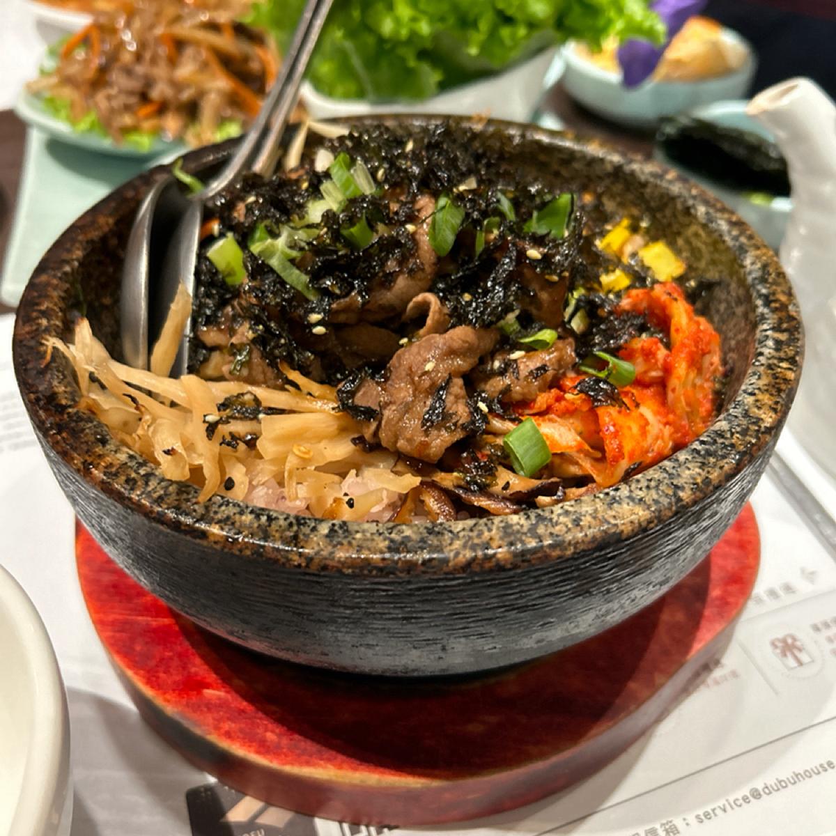 ▫️霜降牛石燒拌飯感覺就是把桌上提供的小菜+肉放在上面,會另外附一碗辣醬,可以加進去拌一拌。慢點吃就會有鍋巴,但我個人比較喜歡吃沒有鍋巴的🤣。