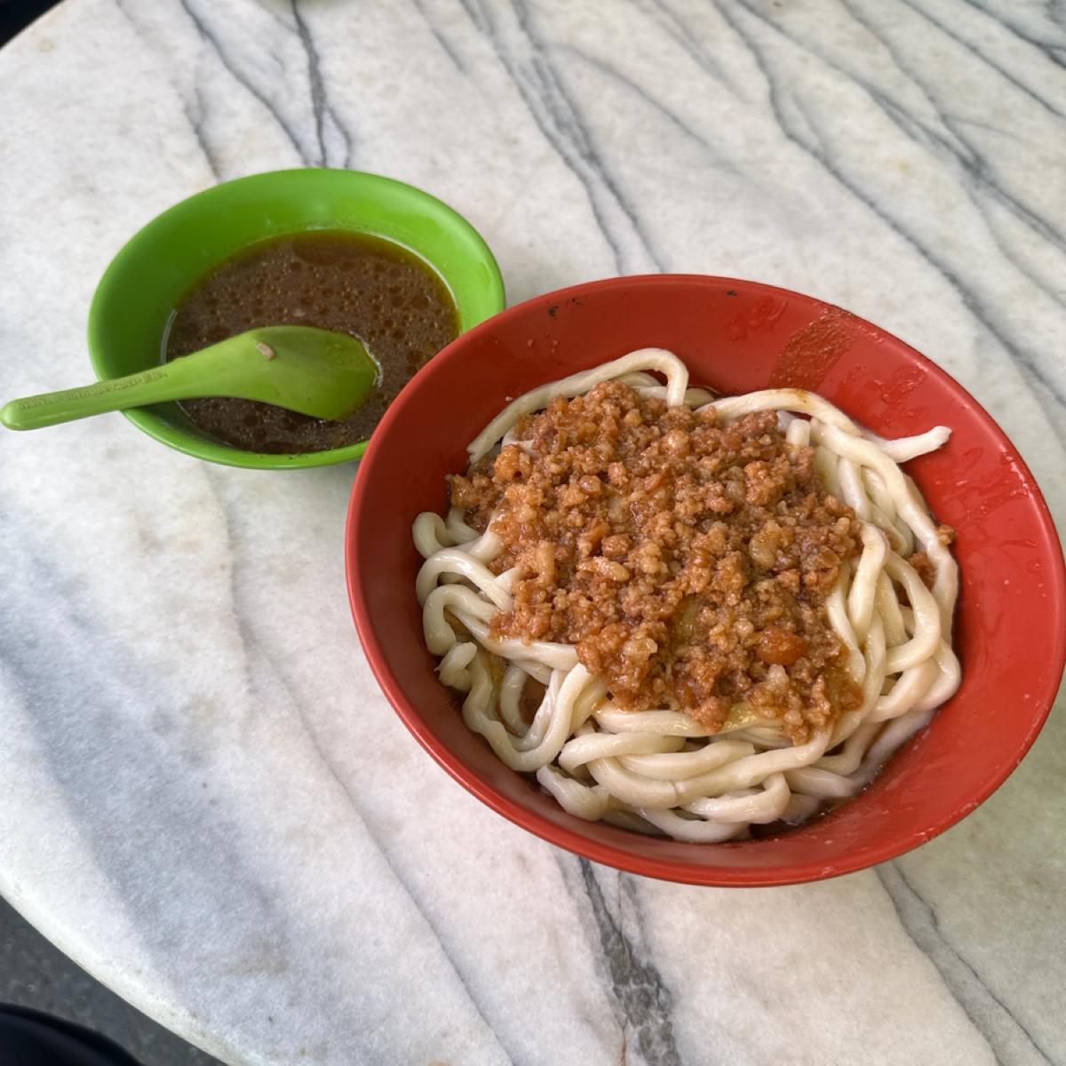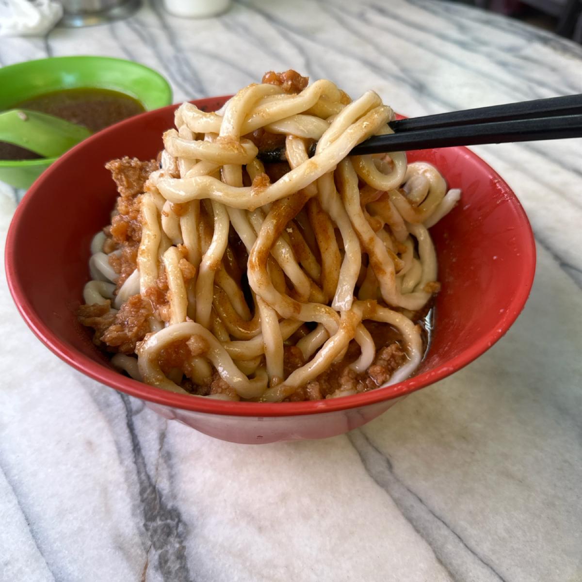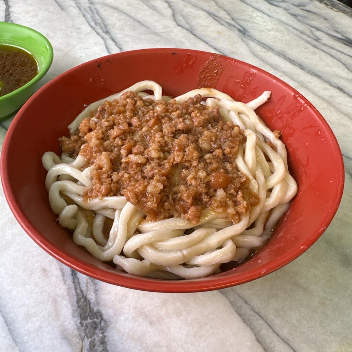 城中老牌牛肉拉麵大王的雙醬拉麵,也是粗麵,有嚼勁又有飽足感,加上很大碗,吃起來基本上飽到晚上不是問題。整碗麵配上雙醬後的口感真的很豐富,肉吃起來也彈性十足。只是要注意這碗麵的口味滿重的,中午吃完後半夜還被抱怨口氣裡有蒜味。