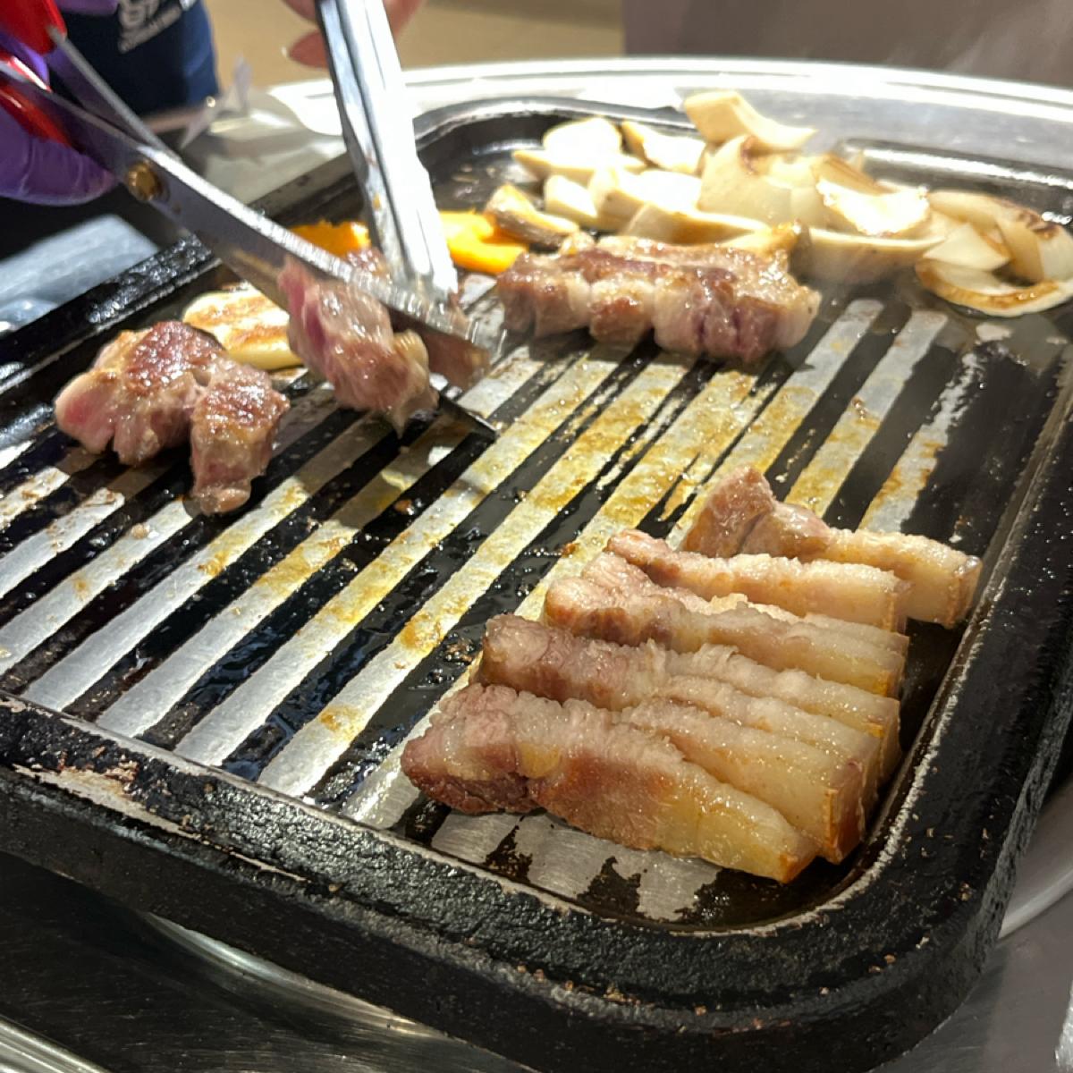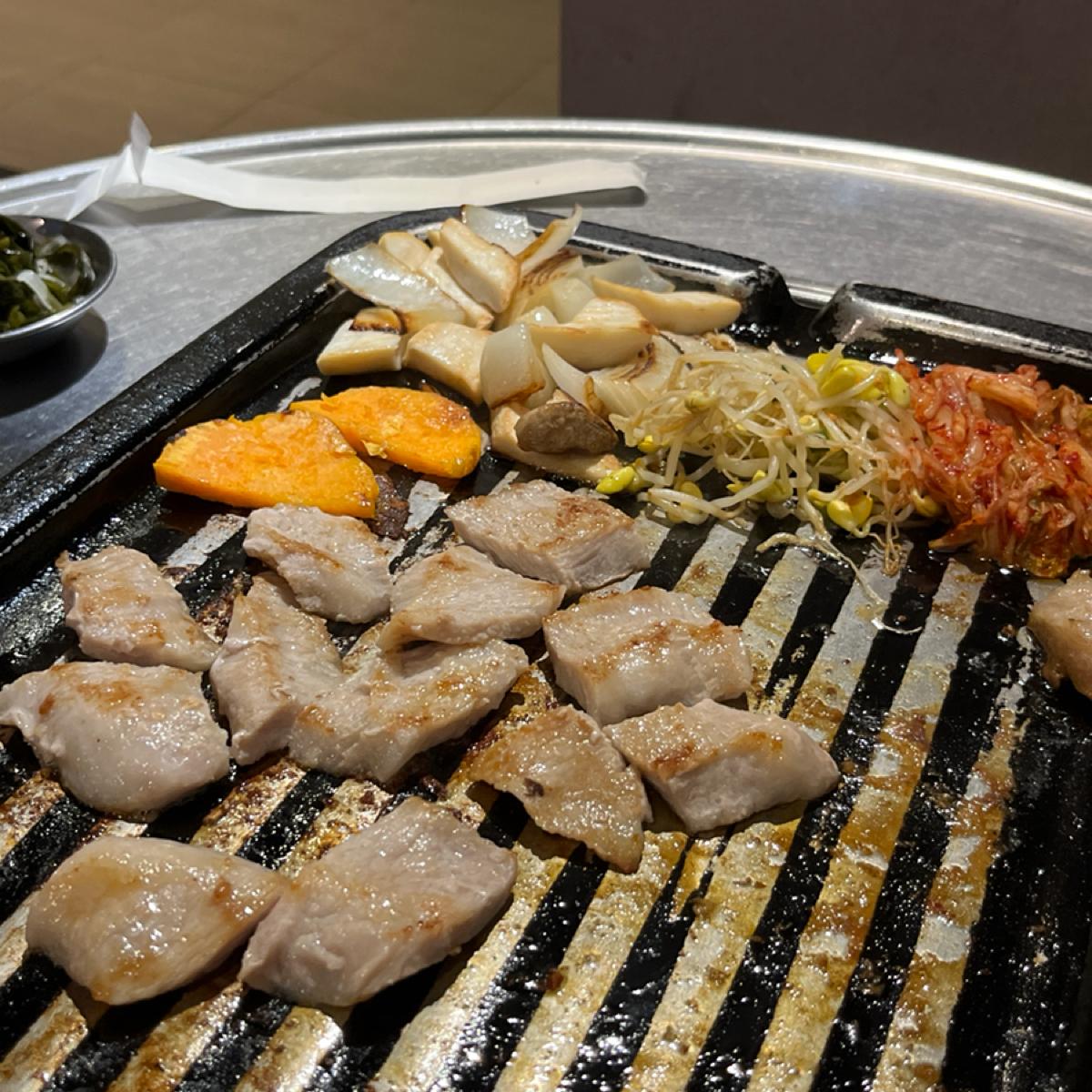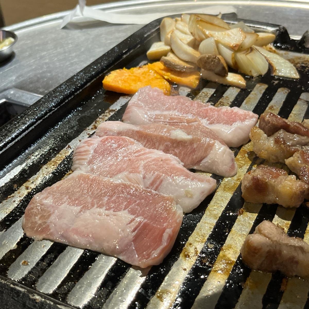 店裡座位其實不多,都是小圓桌,目測塞不下太多人。因為有點早(下午五點左右),我們點的是豬肉拼盤 $999 ,個人覺得份量十足、非常之划算!肉有三種:五花、梅花跟松板,加上各式蔬菜,如洋蔥、馬鈴薯、地瓜、杏苞菇等,可以參考一下照片。全程桌邊幫烤,完全不用自己動手。還有各式韓式小菜,可無限續,味道也都做得很好!搭配啤酒最後吃到我們兩個超撐...推薦喜愛韓式的一定要來試試!