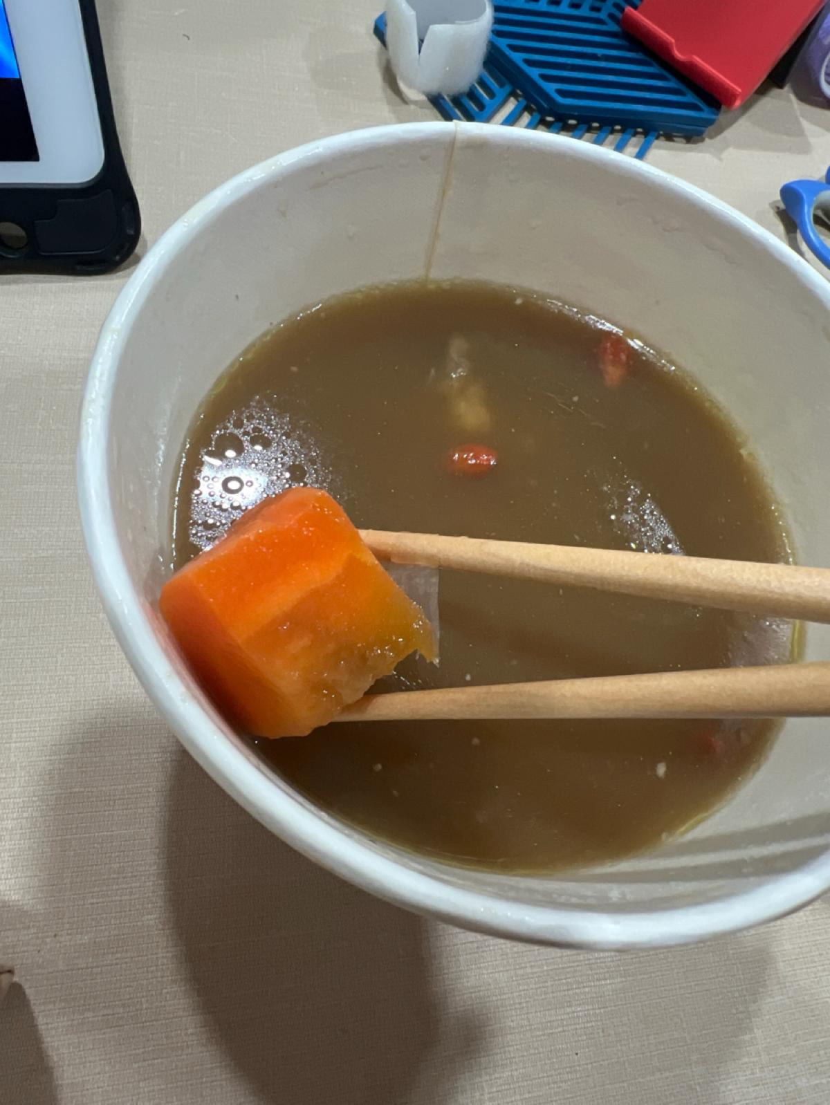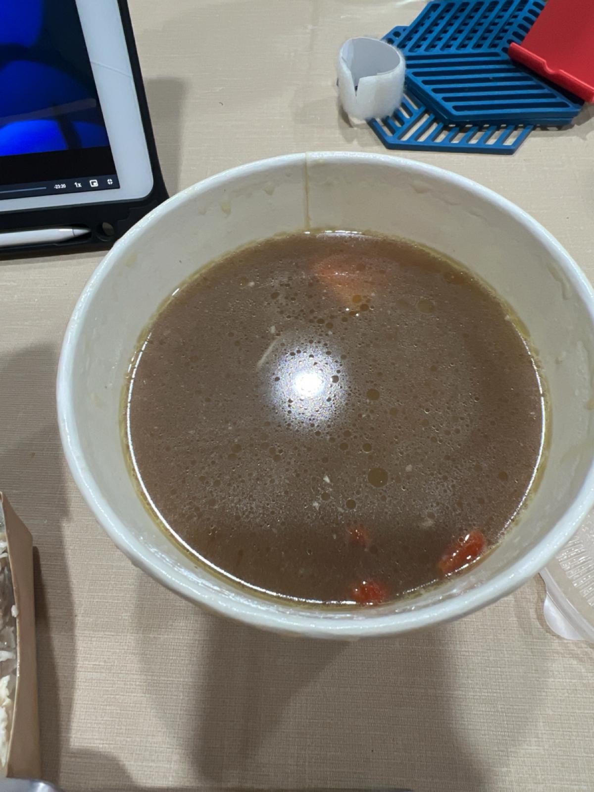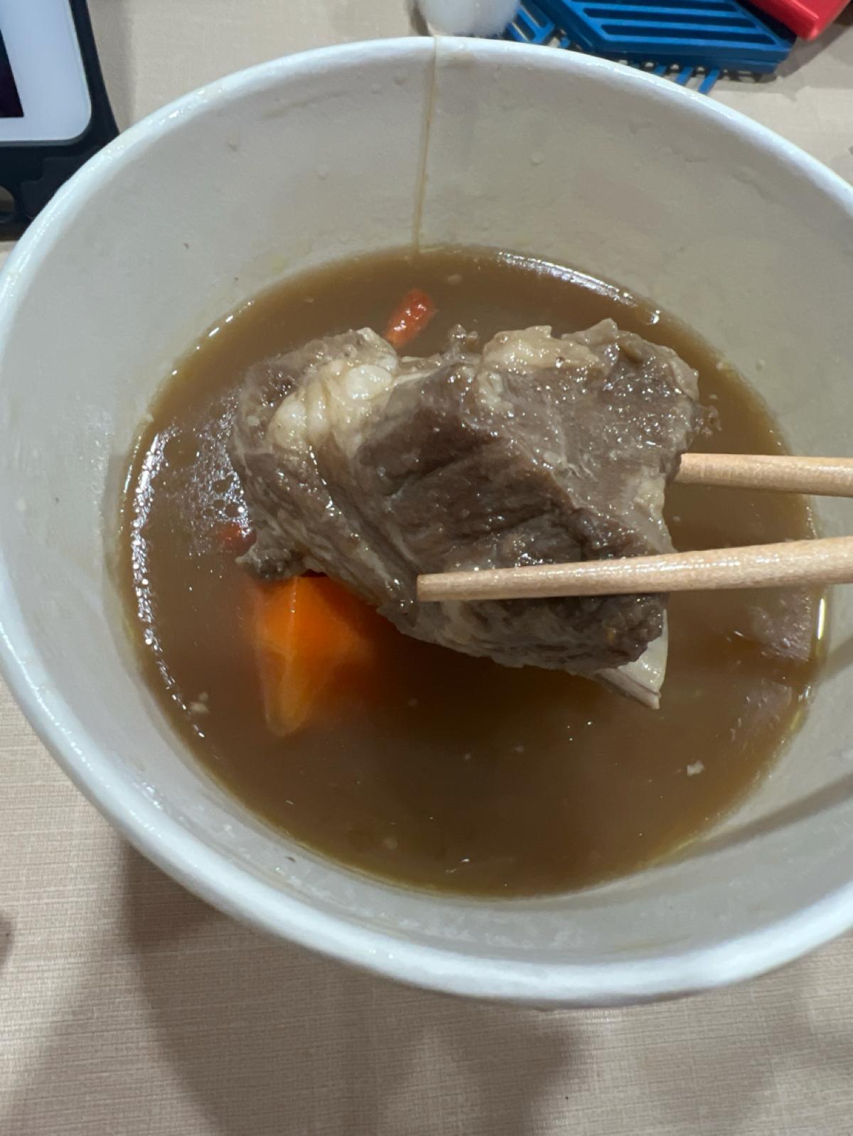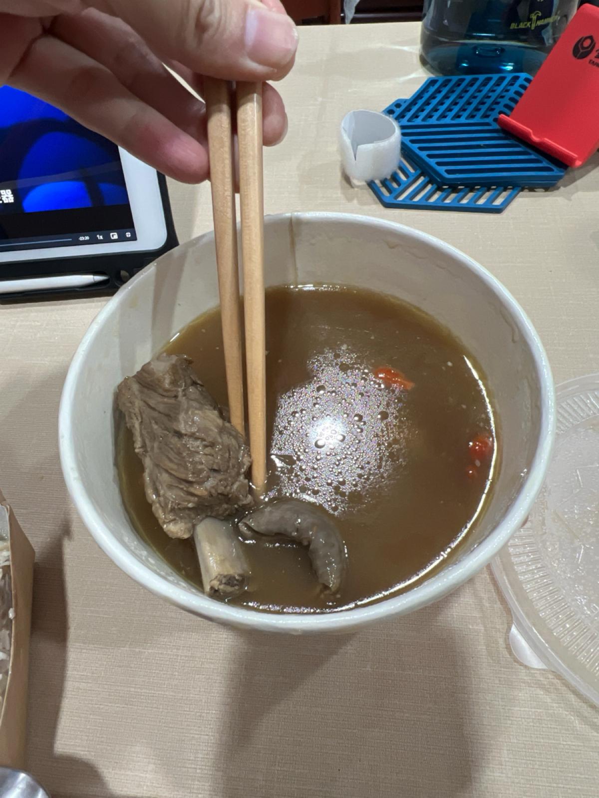 至於肉骨茶,湯頭喝起來還行,帶點藥膳風味,不會太鹹,但內容物真的有點少。排骨大概就兩三塊,湯裡還有一塊蘿蔔,跟一個類似小肚的東西(不太確定是不是)。湯的味道可以接受,但對這個價格來說,料真的不多。