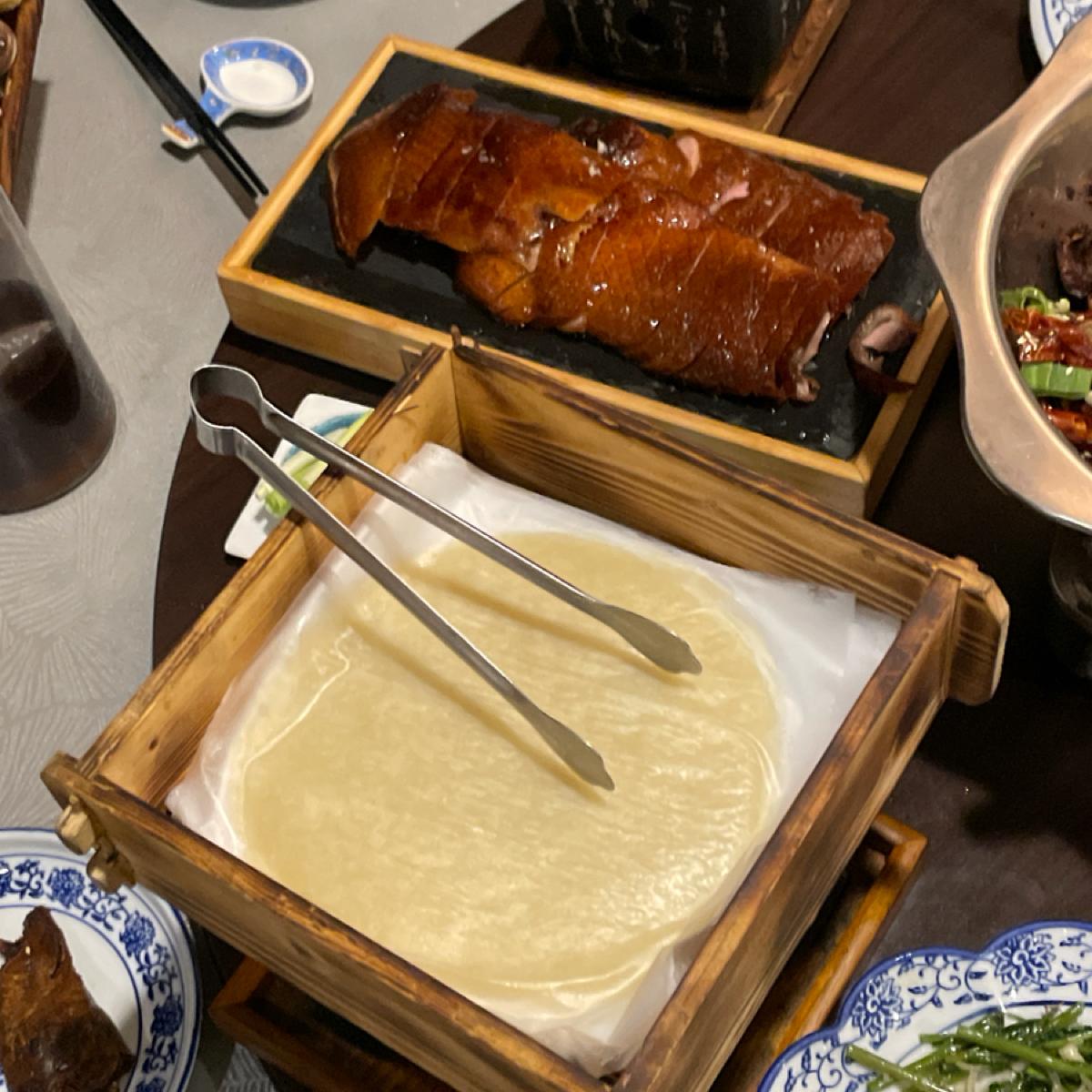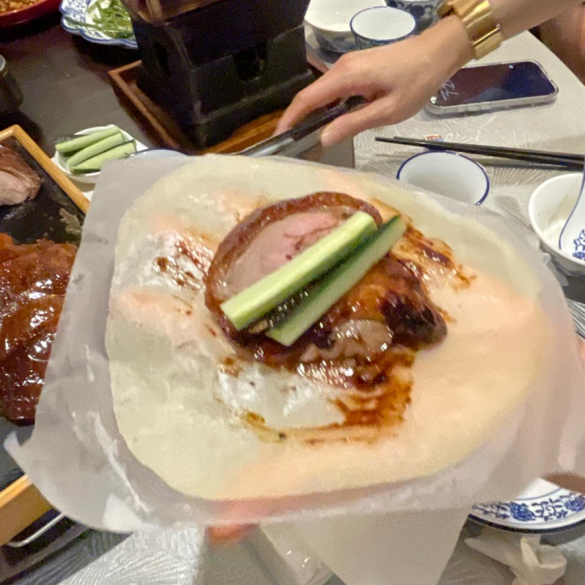 首先片鴨含餅皮、小黃瓜、蔥段,鴨皮蠻脆,加上小黃瓜、蔥段、沾醬自製烤鴨夾餅,還提供小小加熱爐自行加熱,但不能加熱太久會影響肉質。