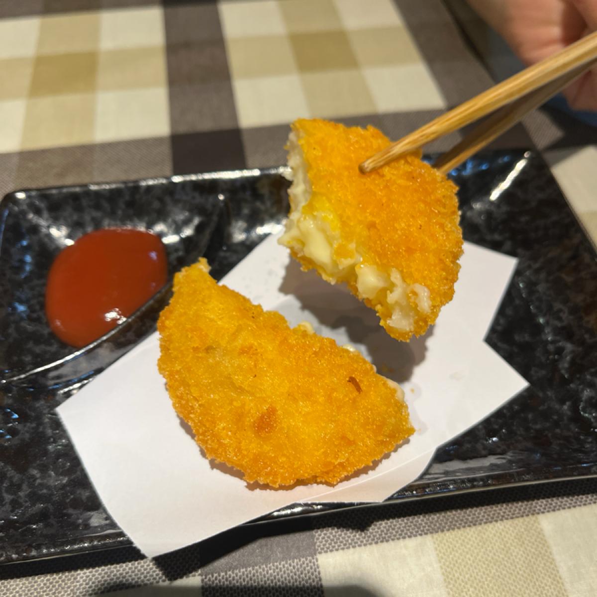 這次我點了牛肉丼飯,搭配洋蔥與醬汁拌炒,牛肉切片鮮嫩多汁、醬香恰到好處,非常下飯。日式可樂餅外酥內軟,馬鈴薯泥餡香滑細緻,中間偶有起司或肉茸,搭配番茄醬很對味。涼拌龍鬚菜作為清爽配菜,有效解膩,龍鬚菜保有自然鮮甜口感,淋上芝麻油與醋汁,風味清爽。