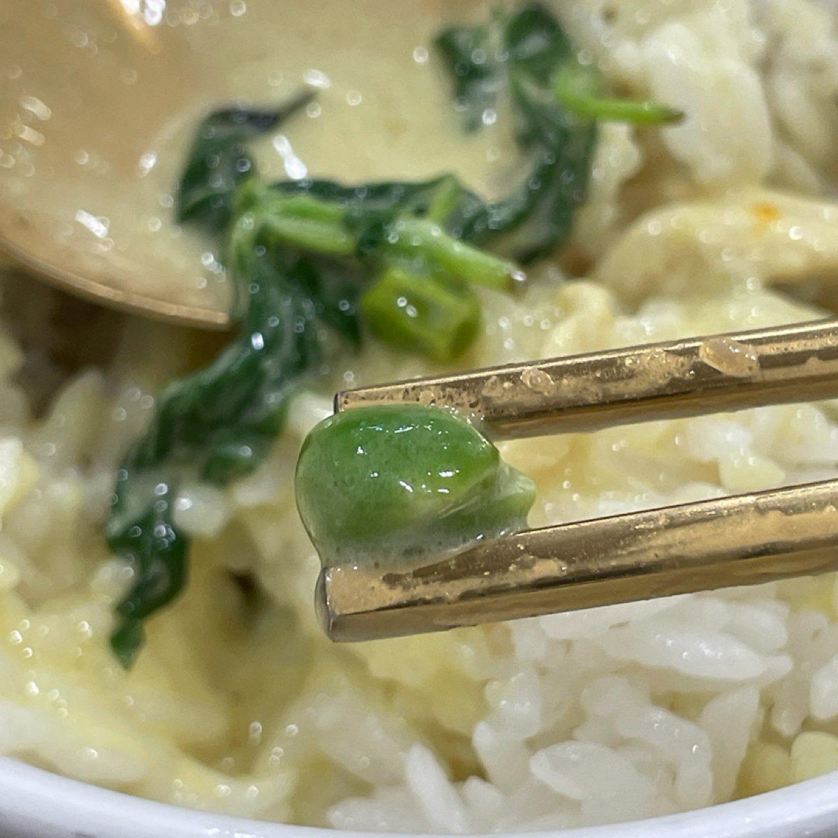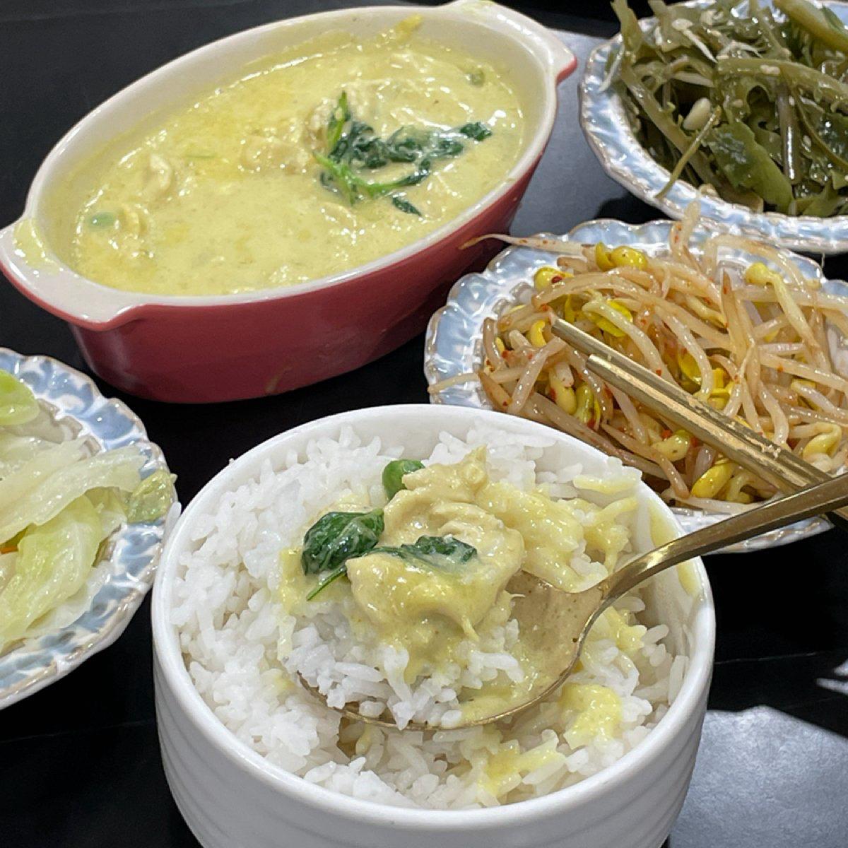 根本白飯殺手,這家綠咖哩醬偏甜,雞肉小塊且軟嫩。搭配滿滿濃郁的椰漿,九層塔香氣十足,白飯有泰國米獨特的茉莉香味!好吃!