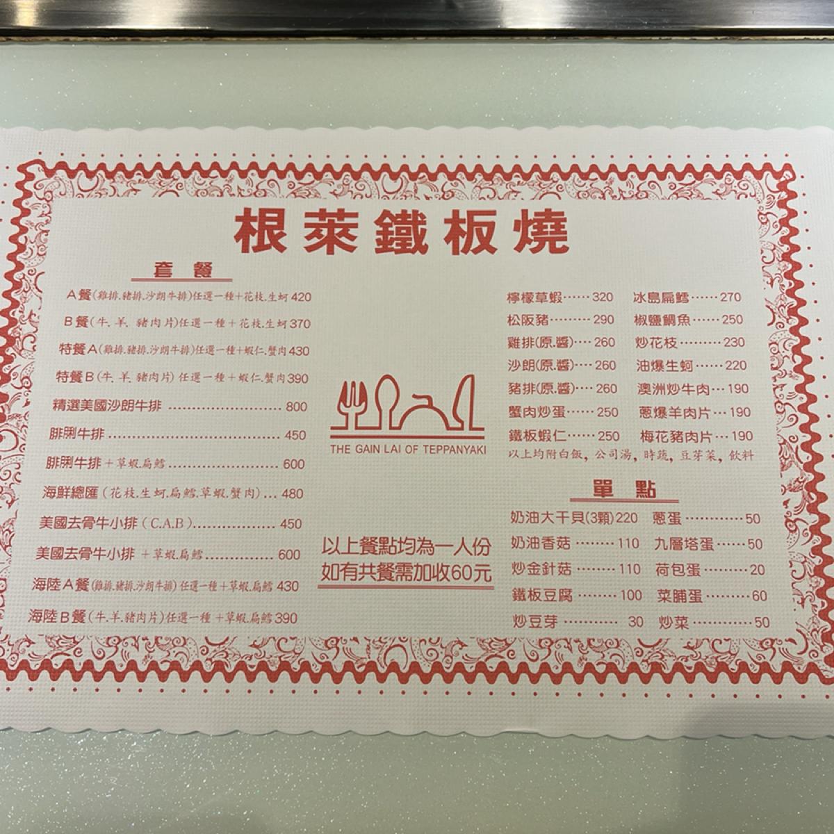 位於西門麥當勞附近的地下一樓,入口的樓梯處有著大大的根萊鐵板燒的字樣,下樓後在左手邊的門,跟櫃台的服務生說有幾位,他就會帶你入座並且幫你點餐,想提醒結帳只收現金哦!