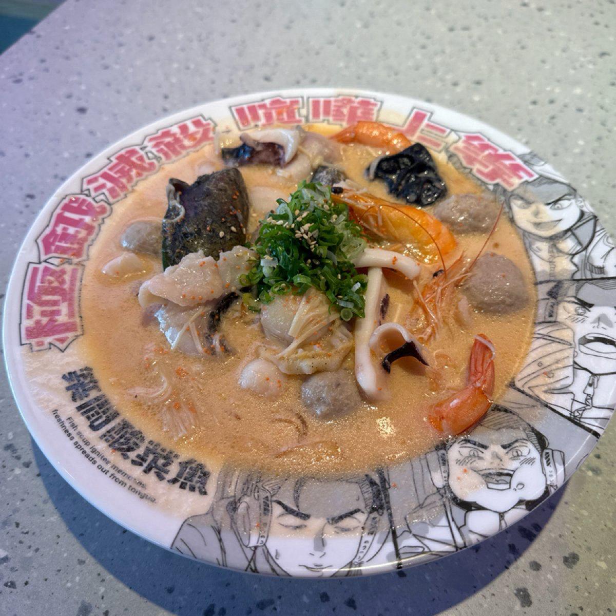 ✅極道明太子奶香魚:配料與海派蝦魚湯類似,不過湯底是使用牛奶湯頭加入了起司、明太子呈現濃厚日式風味。入口可以喝到明太子的鮮甜與牛奶的濃郁香氣,不過味道也偏重口,反而也容易膩口。