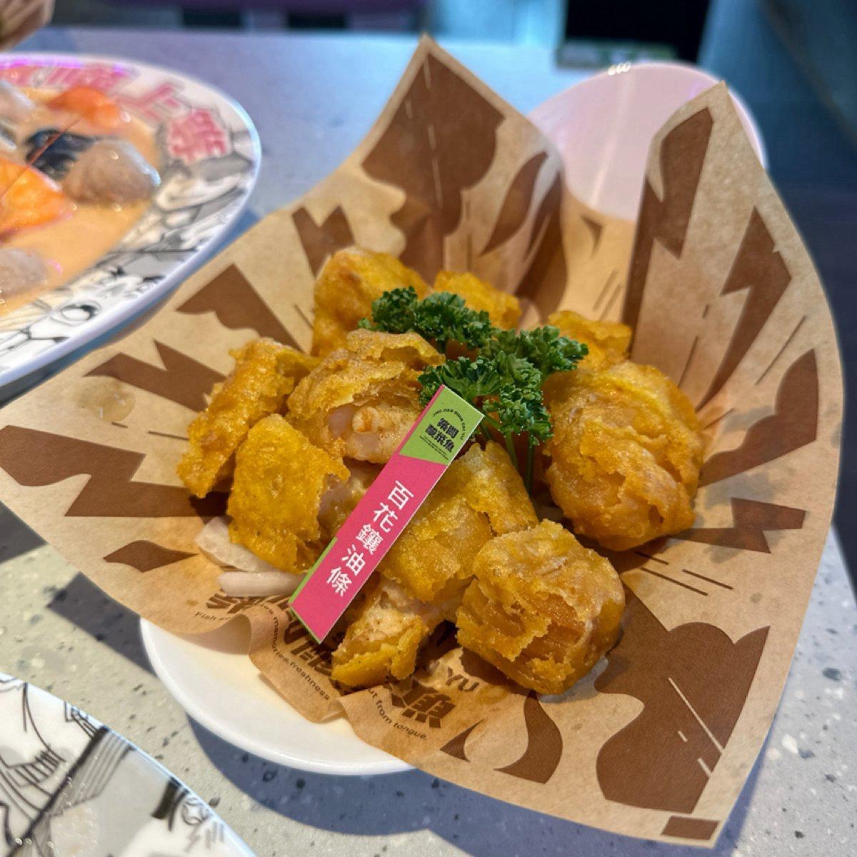 ✅百花釀油條:炸油條裡包著蝦漿,口感層次算是豐富。但致命大缺點是外層炸皮太油膩了,完全無法吃多。只能靠擺在下面的生洋蔥解膩。