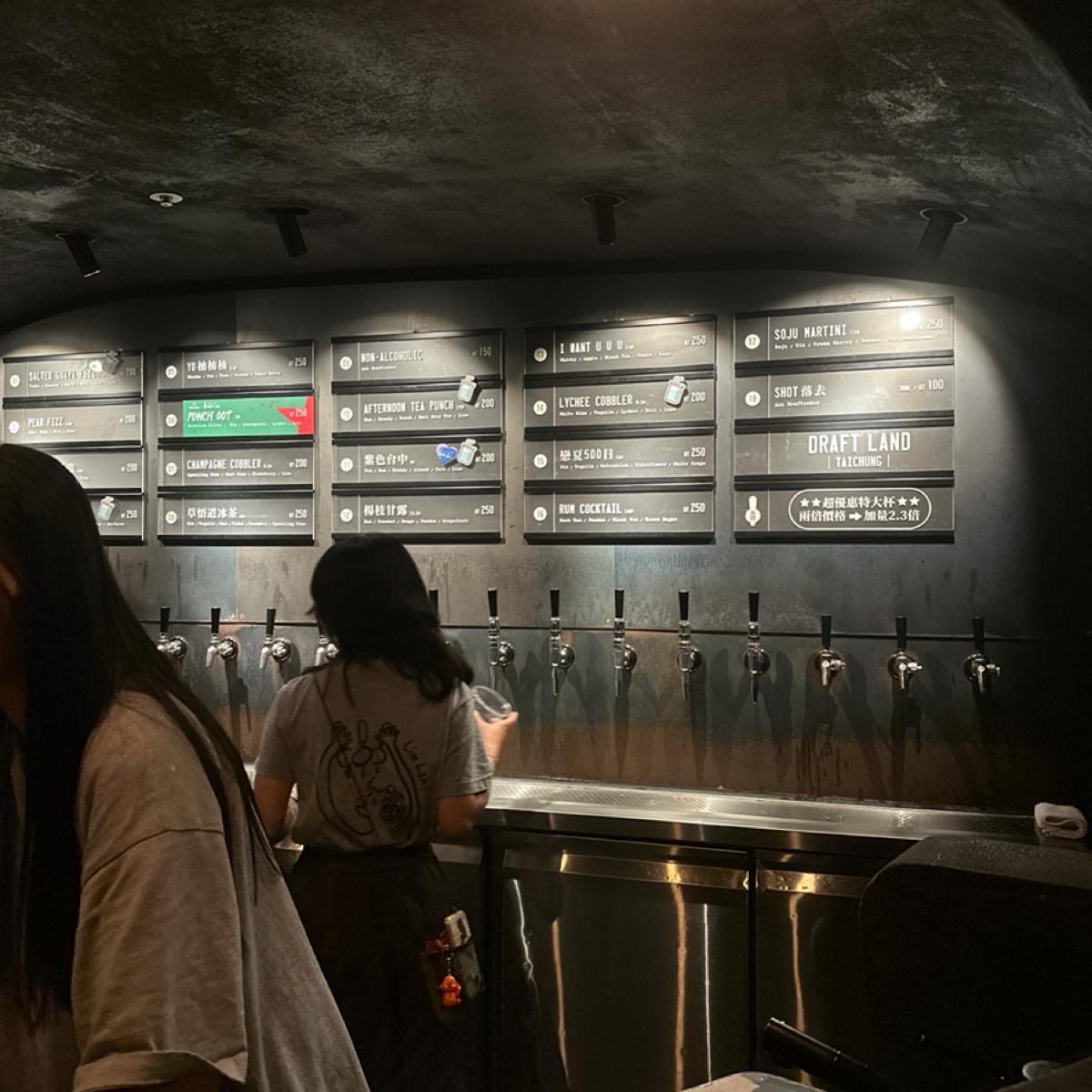 Draft Land 是亞洲第一間汲飲式雞尾酒酒吧,推開不起眼的木門,映入眼簾的是洞穴風格的裝潢,店內座位不多,許多人都是買去草悟廣場享用。